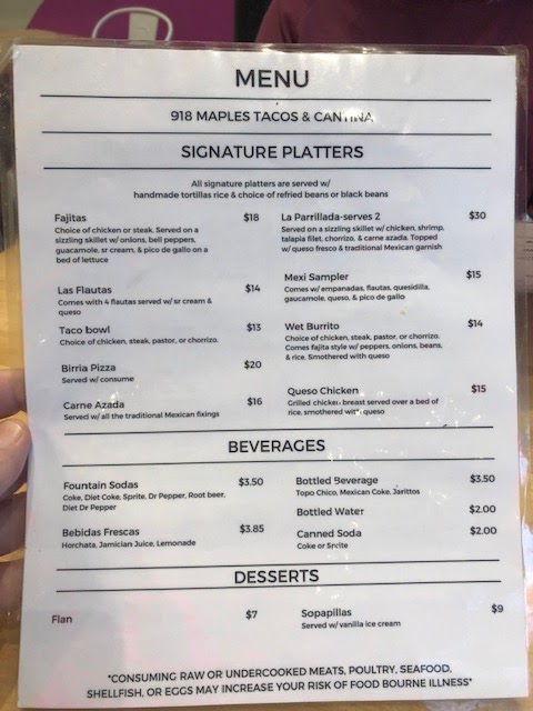 Grab a chair. Start with a michelada and an empanada. If you still have room then finish up with a birria taco plate. Thatâs âWhat to eatâ at 918 Maples Tacos and Cantina.