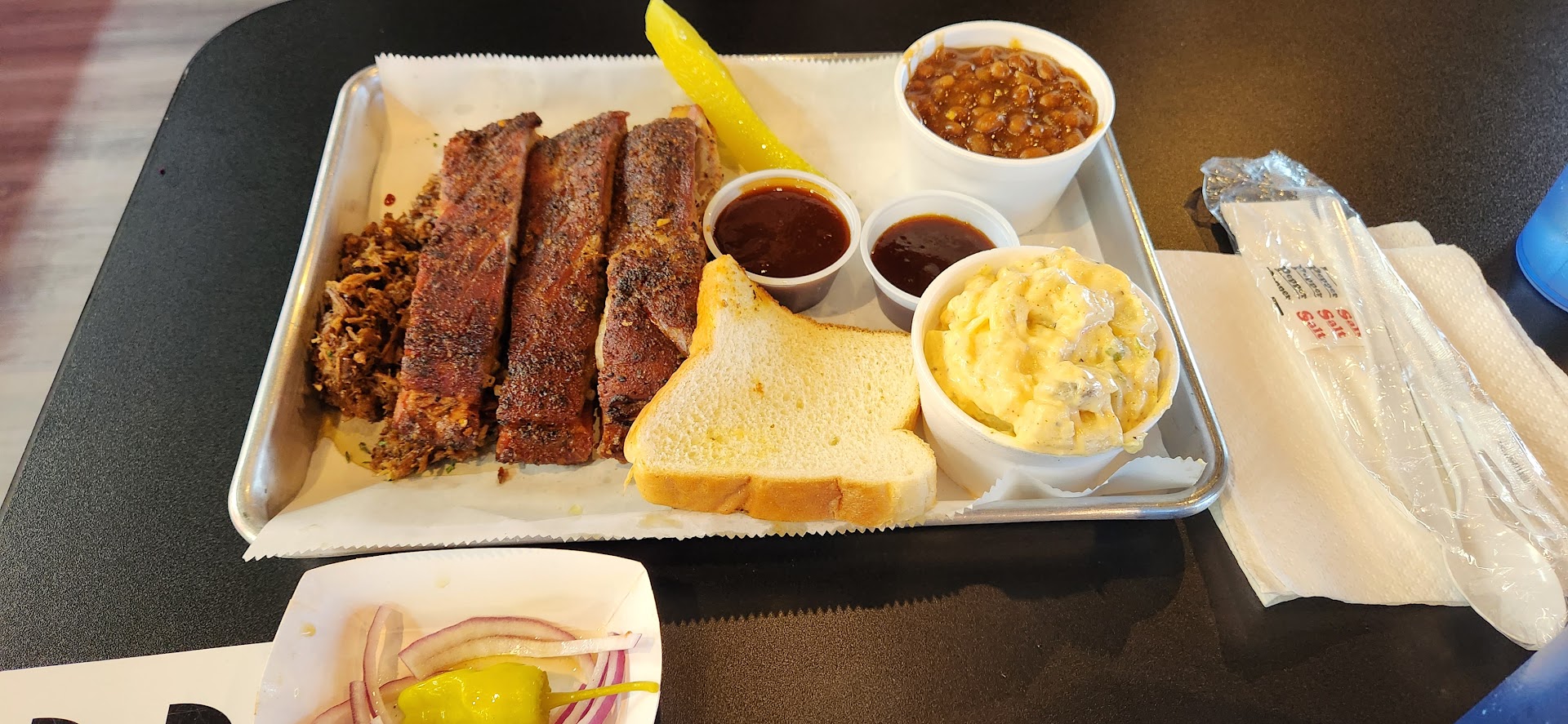 My hubs got the three rib with one meat dinner, which comes with two sides. I picked the three meat with an added rib (surcharge), and two sides came with it as well. We both got water. Finally, the suggested holy grail of desserts, the Smoked Dump Peach Cobbler. All of that came in a bit cheaper than other bbq restaurants in the area with less food and no dessert.