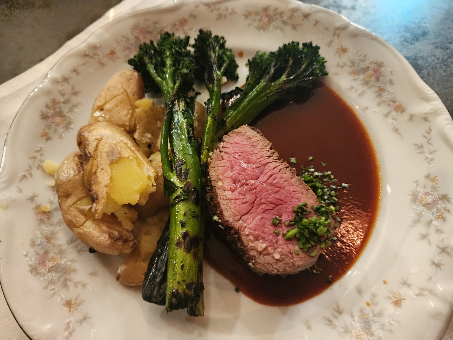 For my entree, I chose the beef tenderloin medallion with braised kale and creamed parsnips. The beef was melt in your mouth tender, and the Syrah (Jake’s suggestion) was the right balance of leathery with hints of dark fruit to show off but not overwhelm the meal. The kale added texture and the parsnips creaminess that could not have been married better. I found myself taking tiny bites to allow me to savor the flavors for longer. Again, I feel that I showed remarkable self-restraint in not licking the plate clean.