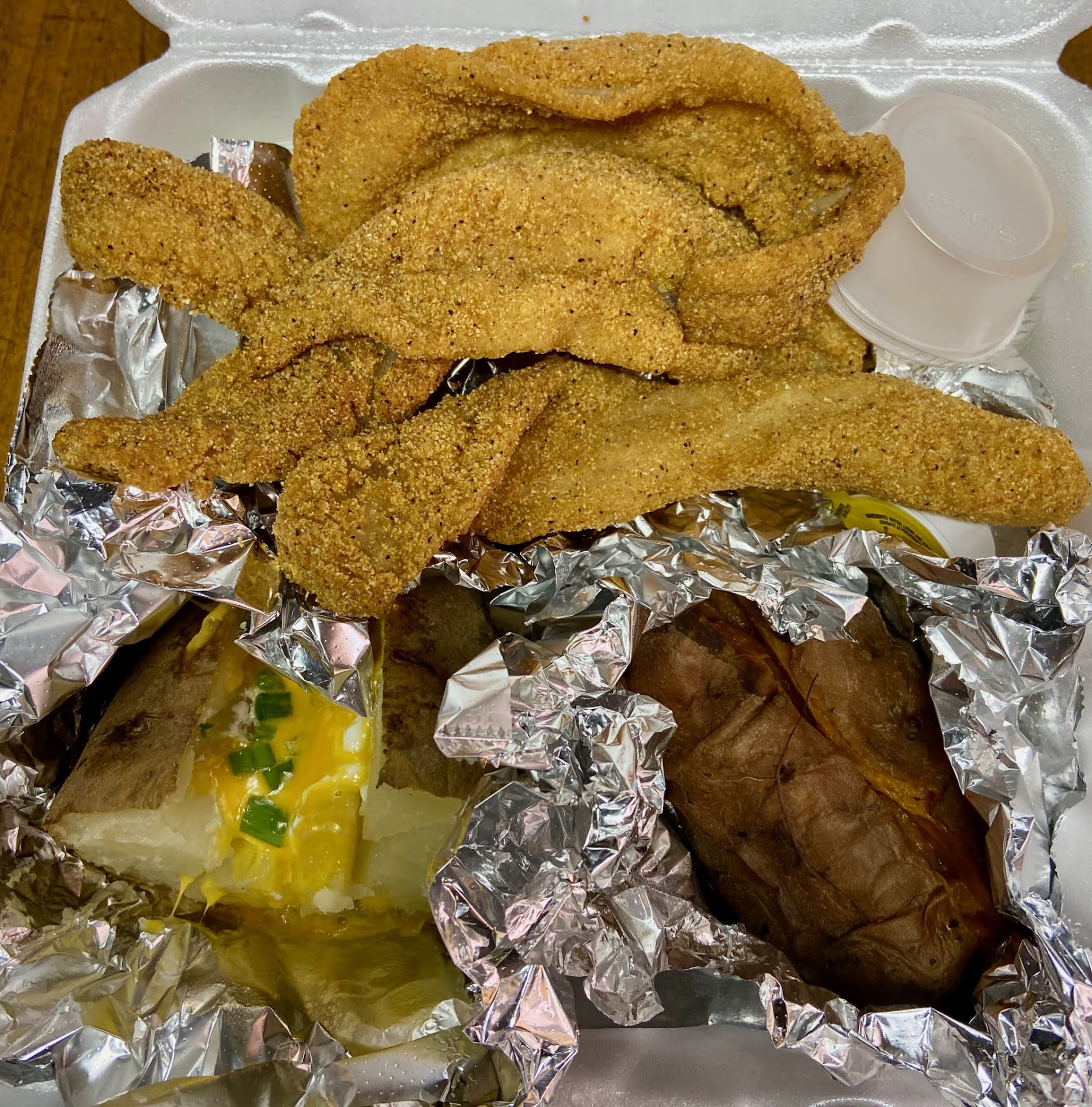 I ordered a Full Catfish Filet Entree (4 filets) with 2 hush puppies, loaded 1/2 baked potato, and a 1/2 Baked sweet potato for $12.99