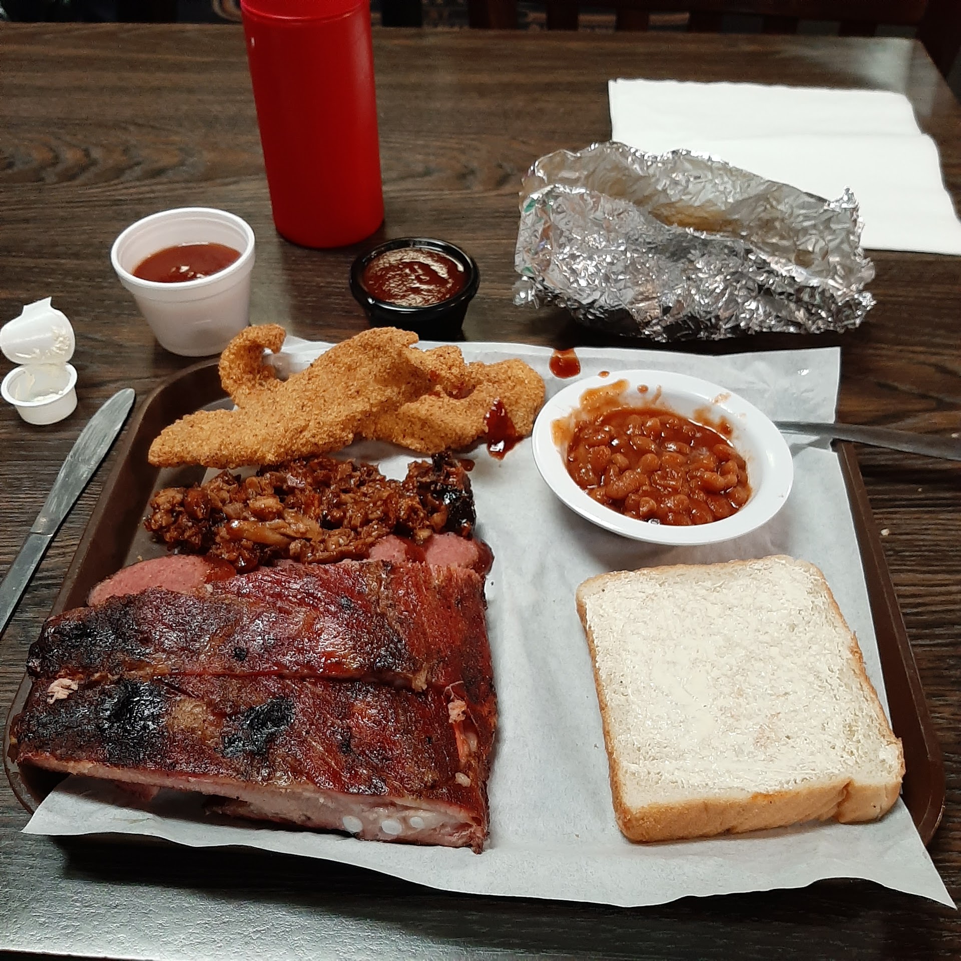 Read moreWe stopped in to Billy Ray's on the way out of town for an overnighter in OKC. It was going to be well past 8pm before we hit OKC and I didn't want to eat that late. As it happened, traffic on the highway was a parking lot due to the interchange construction, so I jumped off to SW Blvd to take the "short cut". Seeing Billy Ray's was still open, we opted to get a bite to eat there. Overall, it was a fairly good experience. The staff were great. Friendly, always checking on us, made us feel welcome. The Wife got a 2 meat combo with tabouli and baked beans, while I went with The Assortment, which was chopped brisket, sausage, ribs and catfish, also with tabouli and baked beans.