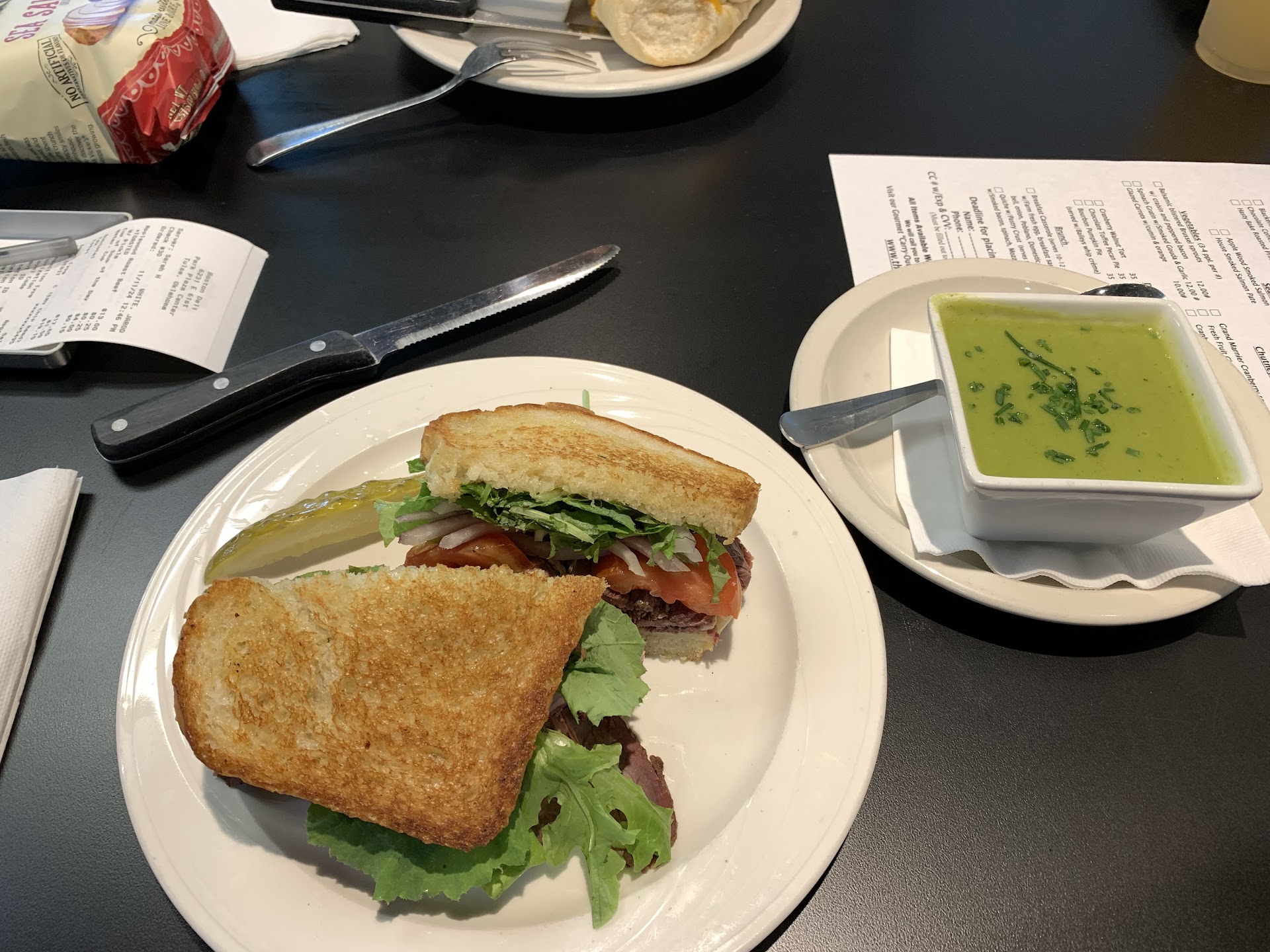 We arrived almost exactly at noon. The interior occupies a corner building and has two entries, one operates as a market while the other is the deli/restaurant. The deli side is rather straightforward: self-serve beverage station, standard lighting with sufficient windows that invites just enough sun inside, a pastry stand at the checkout station, a mix of tables and booths. I ordered the Applewood Smoked Roast Beef Sandwich with the Asparagus Soup (soup of the day). She ordered the Applewood Roasted Beef Au Jus (which I was jealous of). It wasn't crowded, being Monday, so we sat in a booth after we ordered. The food didn't take long at all, 10 minutes MAXIMUM, and came out steaming! I dug into the soup first, which I wish I would've gotten the bowl instead of the cup because I'm not much of an asparagus fan but the soup convinced me otherwise. No distinct flavor but it was thick, smooth and tee'd up the sandwich as it should. The Roast Beef sandwich was great! A good balance of ingredients and the bread, soft, toasted and buttered, made for a perfect finish. Unfortunately I didn't get to try my friend's Au Jus Roast Beef sandwich but it will not escape me next time! Even though we didn't need or see much of her, our server Sarah) was great by taking our order, bringing us refills, and processing the check. Overall, I couldn't have chosen a better place to check-in on our lunch break.