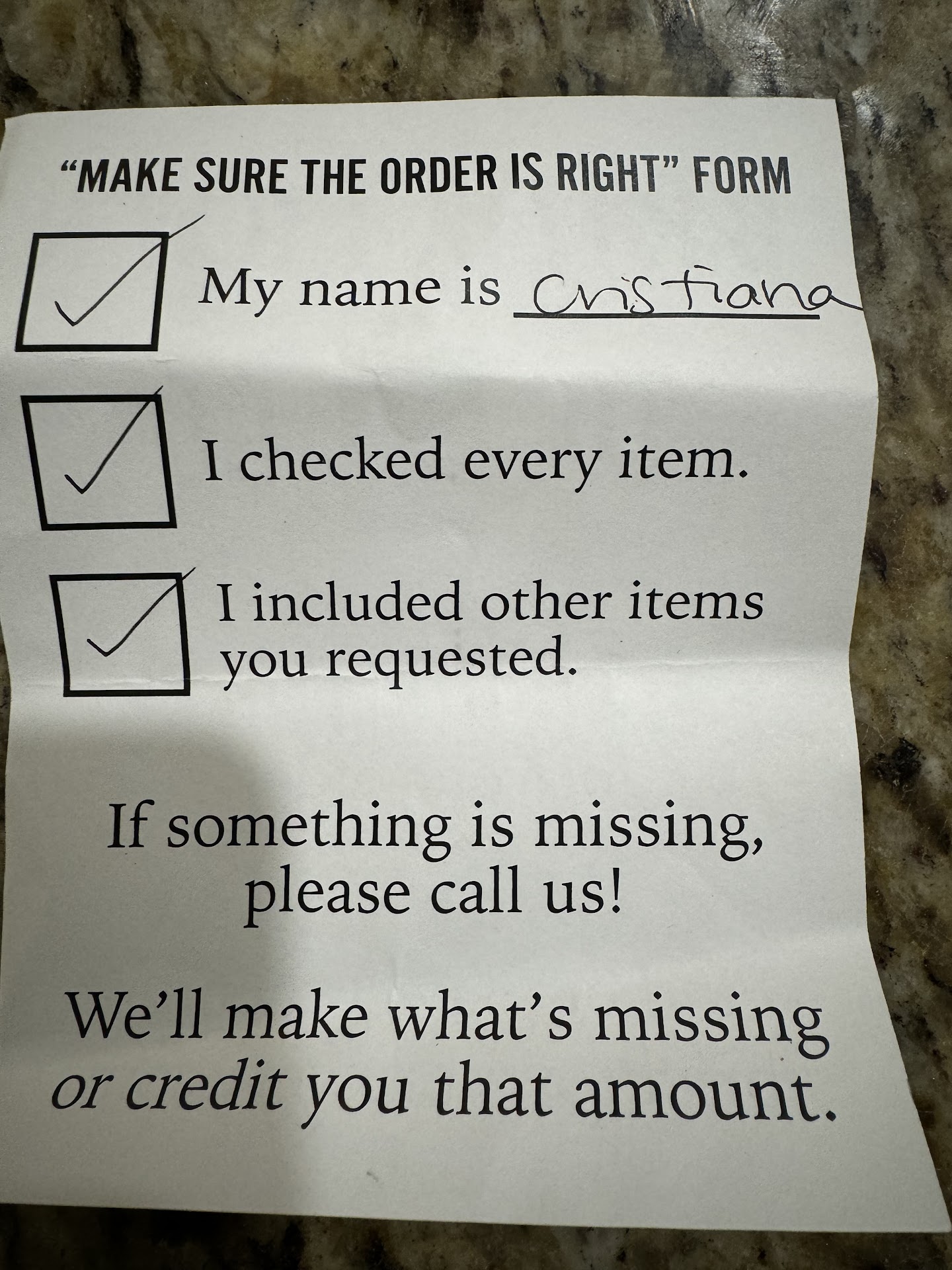 Last time, the manager, Christina, provided me with two $10 coupons for my trouble. I had no intention of using them, but as I’ve mentioned in previous reviews, my kids enjoy eating at Bricktown and convinced me to give it another shot. Unfortunately, this experience was no different. When I placed my order with Brittany, I explicitly asked a second time to hold the chili sauce. Brittany reassured me, saying, "I got you, I even circled it." Yet, somehow, this crucial instruction never made it to the ticket (see attached).