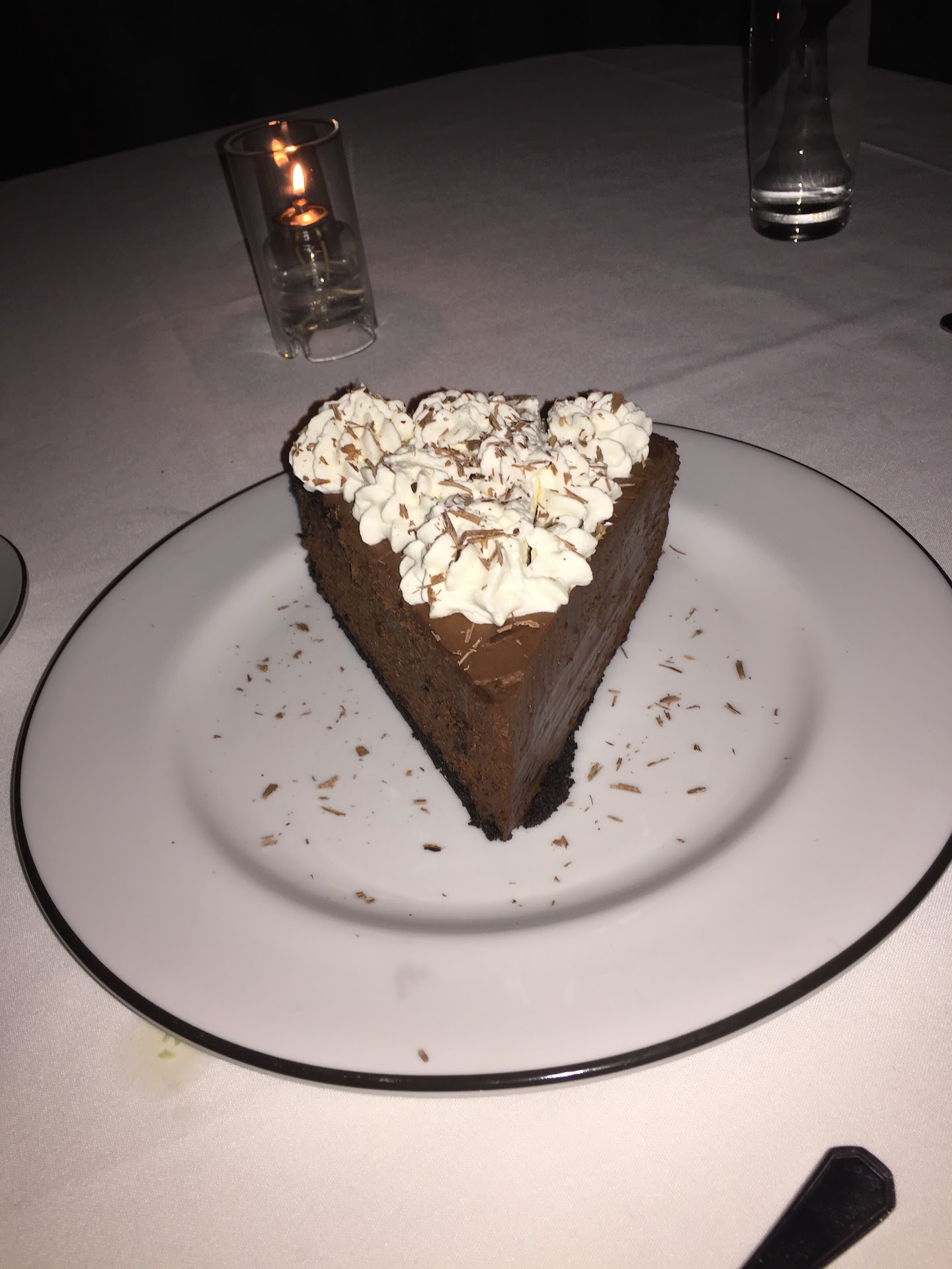Saving room for dessert is a must. Based on reviews we had read before coming here, we were excited to try the foot-tall piece of chocolate cake, so we were at first disappointed to hear that it had been discontinued (it was a 3-day process in house, ended up getting outsourced to keep up with demand, and quality went way down). Our server told us we should try the chocolate mousse pie, which ended up being some of the best restaurant dessert I have ever had. The portions are huge (the one "slice" we were served took up nearly a whole dinner plate and the three of us finished barely more than half of it) and it's worth every cent of the $20 price. And on that note, don't hesitate to take anything home—it's all too good to let go to waste.