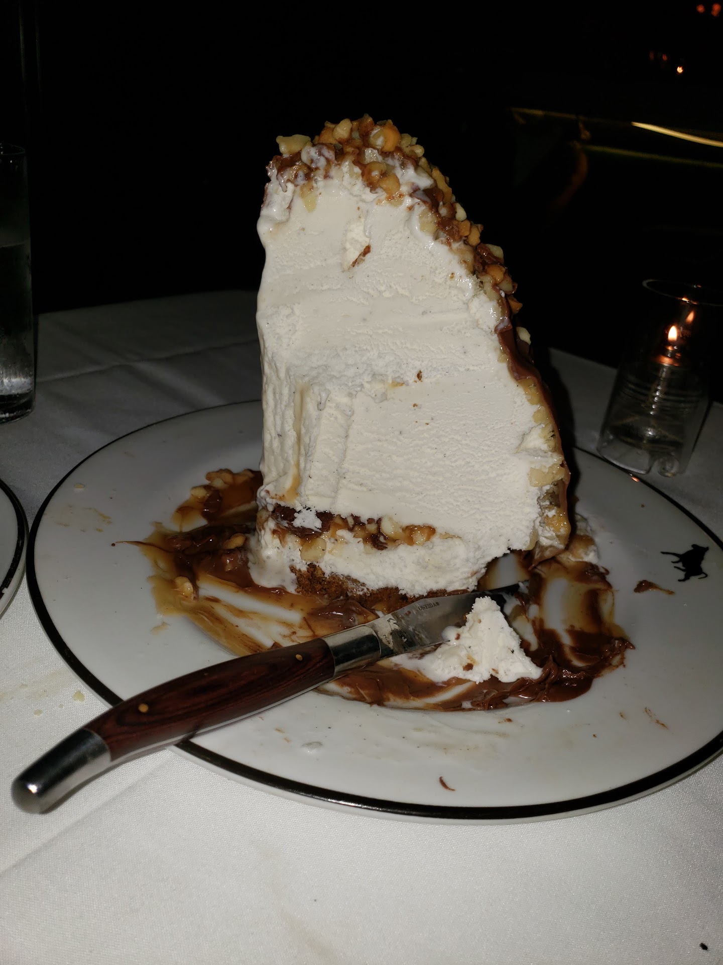 Saving room for dessert is a must. Based on reviews we had read before coming here, we were excited to try the foot-tall piece of chocolate cake, so we were at first disappointed to hear that it had been discontinued (it was a 3-day process in house, ended up getting outsourced to keep up with demand, and quality went way down). Our server told us we should try the chocolate mousse pie, which ended up being some of the best restaurant dessert I have ever had. The portions are huge (the one "slice" we were served took up nearly a whole dinner plate and the three of us finished barely more than half of it) and it's worth every cent of the $20 price. And on that note, don't hesitate to take anything homeâit's all too good to let go to waste.