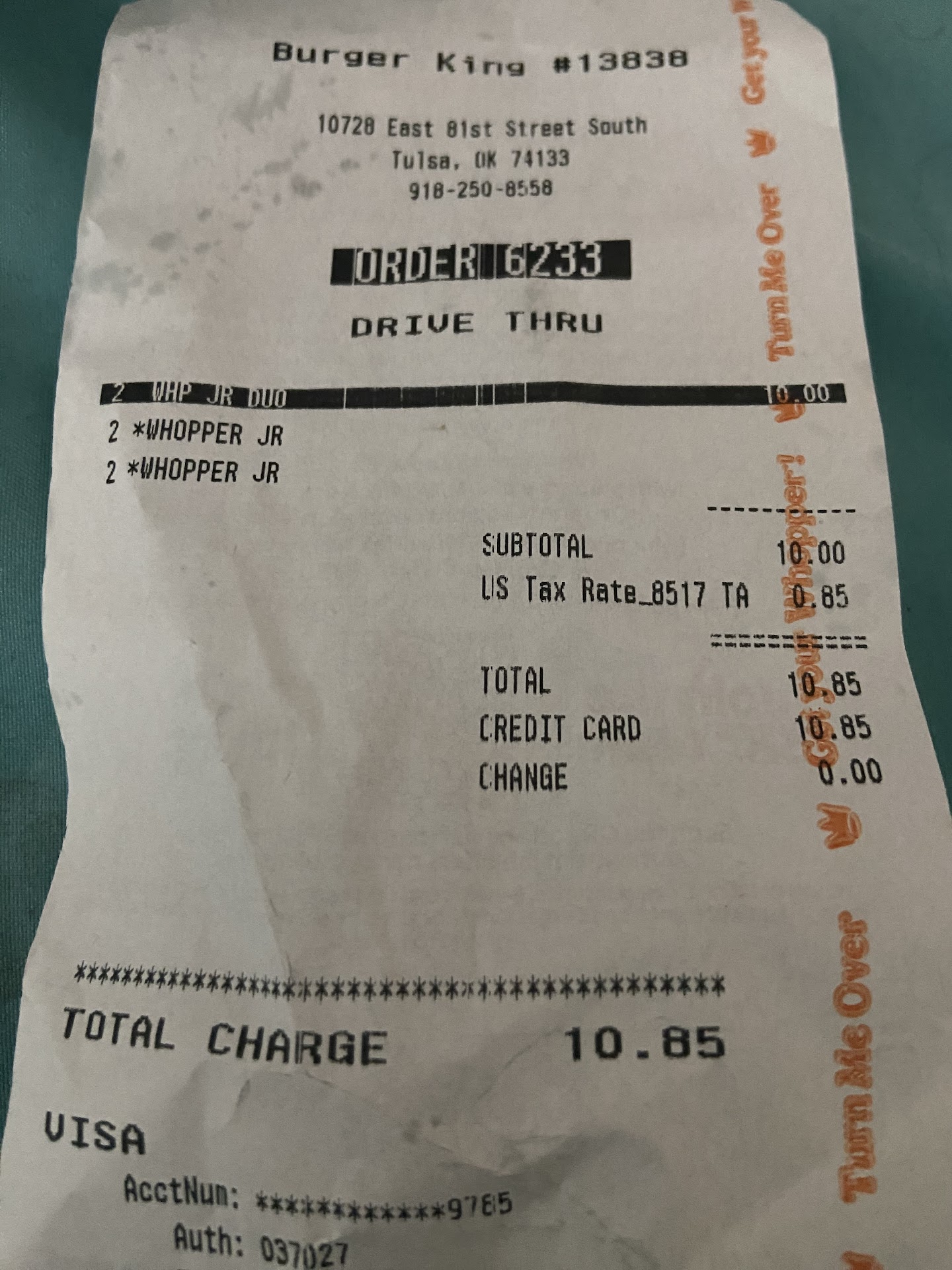 Ā Ā Ā Read moreIt's okay for once in a while but boy, do they oversalt the French fries! I enjoy fries as a treat, but not if BK is trying so hard to "brine" me! Salt like that is an enemy, and I felt sick about 20 minutes after eating some fries, like a salt overdose! If they can't lesson the amount of salt they use, then I'm not going to eat from there anymore. I did give 3 stars but lowered it to two stars bc I feel BK doesn't care about oversalting. The building inside looked clean and the employees appeared to be working hard, keeping the place nice, but the exterior left much to be desired with the outdated, old-style look, no landscaping, broken asphalt, beat up parking lot, and the cars parked in the handicap with no placard and no plate, forcing marked handicap people to hobble in from a far away parking spot. In fact, one car, a red car, had removed their license plate altogether and had no identifying handicap placard, yet parked in handicap. So it might be they have just 2 handicap spots. Then some city worker drove in and took a handicap spot but had no placard or plate, so BK isn't so handicap friendly, bc they allow anyone to park...