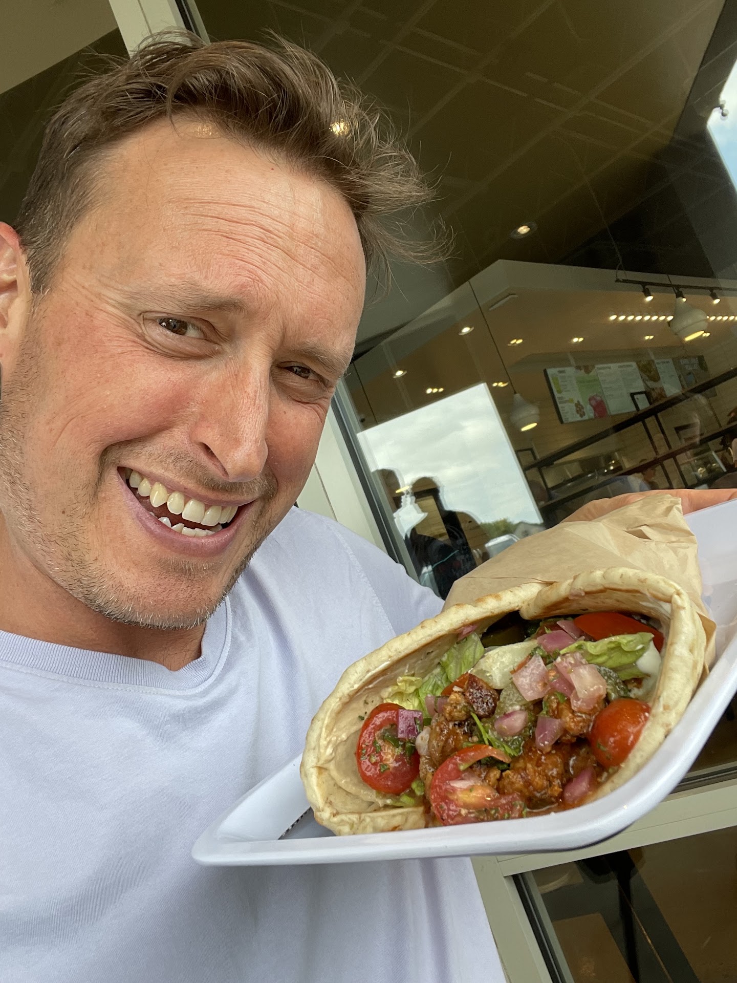 I ordered the Greek Chicken Pita, shown here. Now, if youāre looking at the pic I posted and thinking to yourself āIām not sure whether this guy is happy or angryā, please know that Iām growing older and more bird-like with each passing year, so sometimes my expressions are hard to distinguish (just ask my family). For clarification, the face Iām trying to convey here is, āHeck yeah!ā.