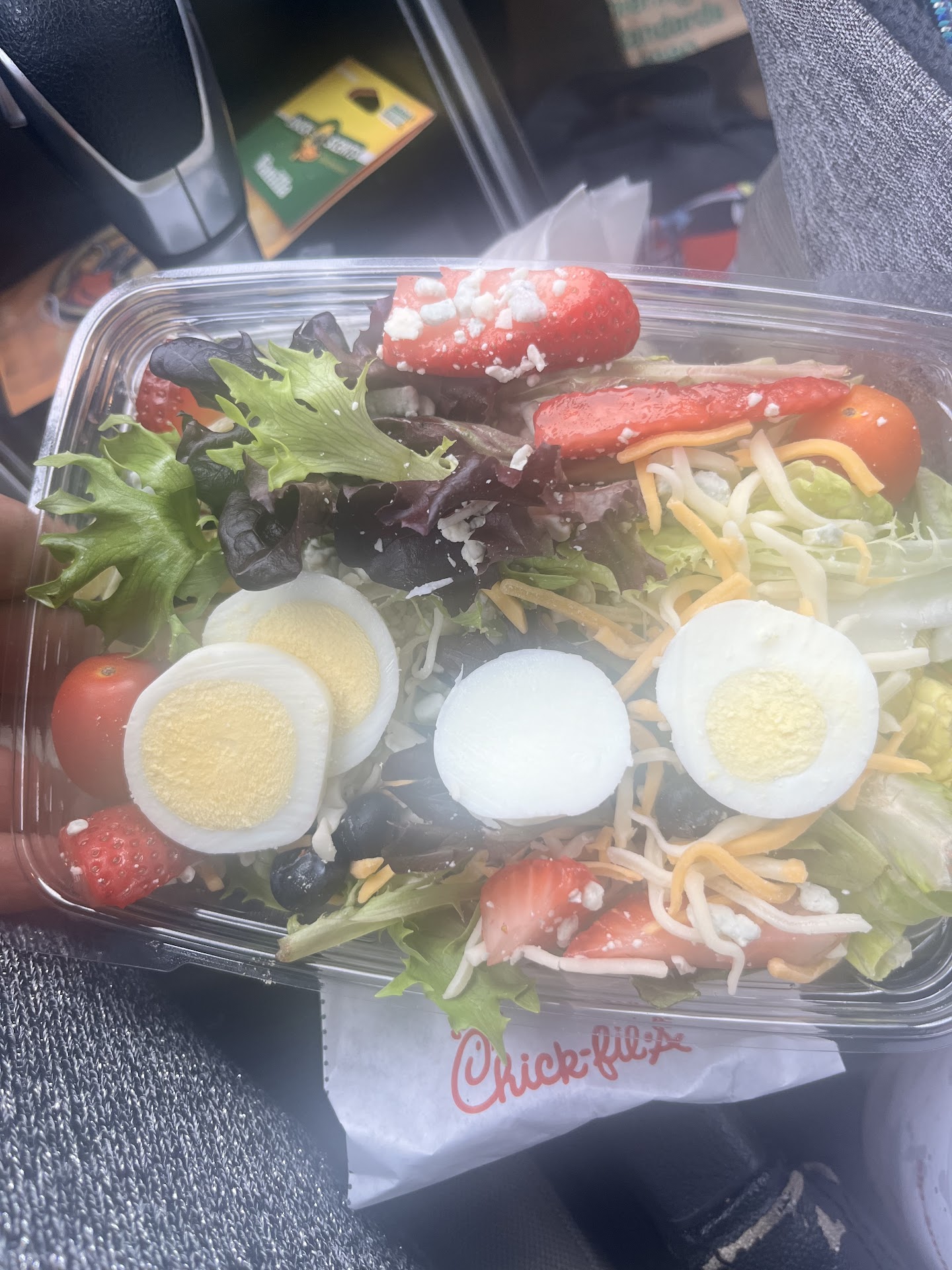 Unfortunately, I was given a a side salad with a few strawberries, a few blueberries, and an egg. This message is not to criticize at all. It is to help the store and the customer who is looking to grab a fresh fruit garden salad with no meat.