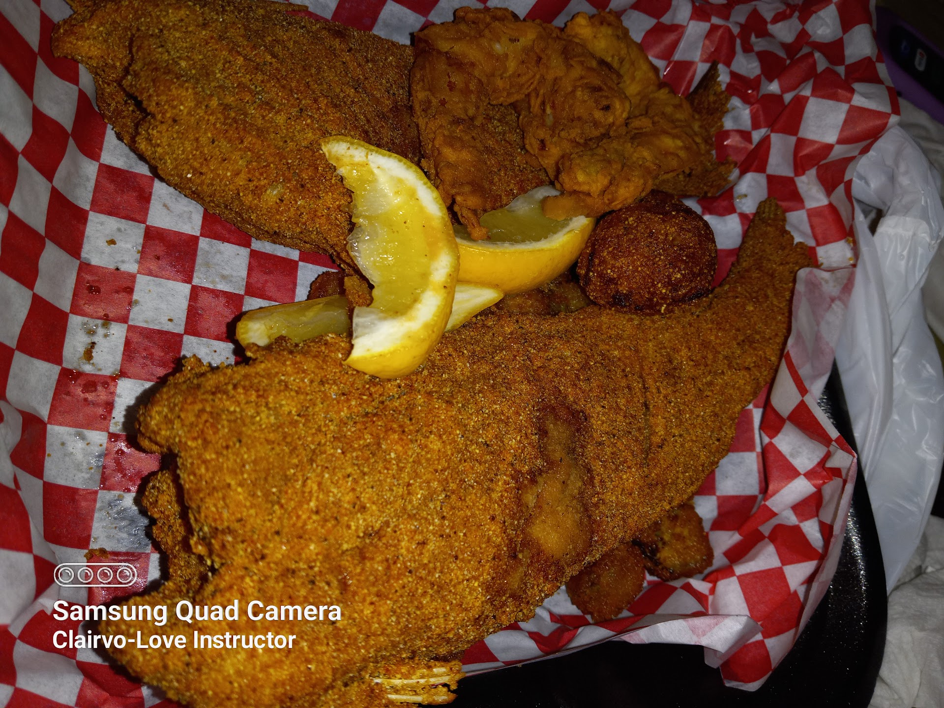 Food: Awe lord!! I asked for the three piece fish and shrimp grilled and for the sides hush puppies and beans. It was great! I loved the juicy grilled shrimp with a tangy sauce. Mmm mm mmm .