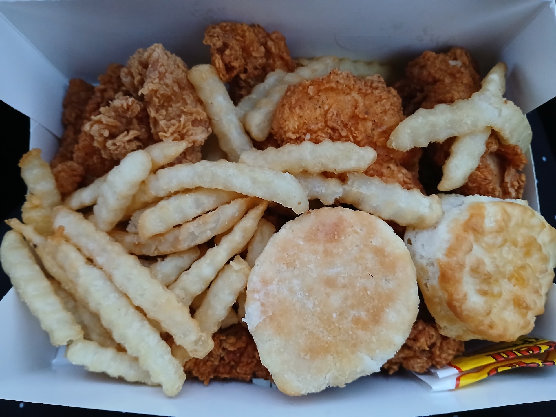 First off, the chicken. What the heck? Where's the seasoning? The flavor? I heard it was iowa that doesn't season their chicken. Seriously, this is bland! Good price, blah flavor. Wasn't greasy though, that surprises me.
