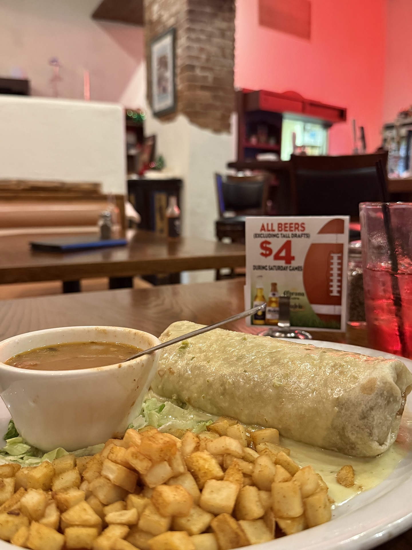 We usually have to wait about 20 to 25 minutes before our food arrives. Our food arrived in about 10 minutes after we received our chips and salsa. I was shocked, and I asked the waitress why it was so fast and she said that they had some already made. (Wait! They had some already made??) I could have went to Taco Bell if I wanted that kind of service. I did not like that because I like my food cooked fresh and I don't mind waiting a long time for it to get done.