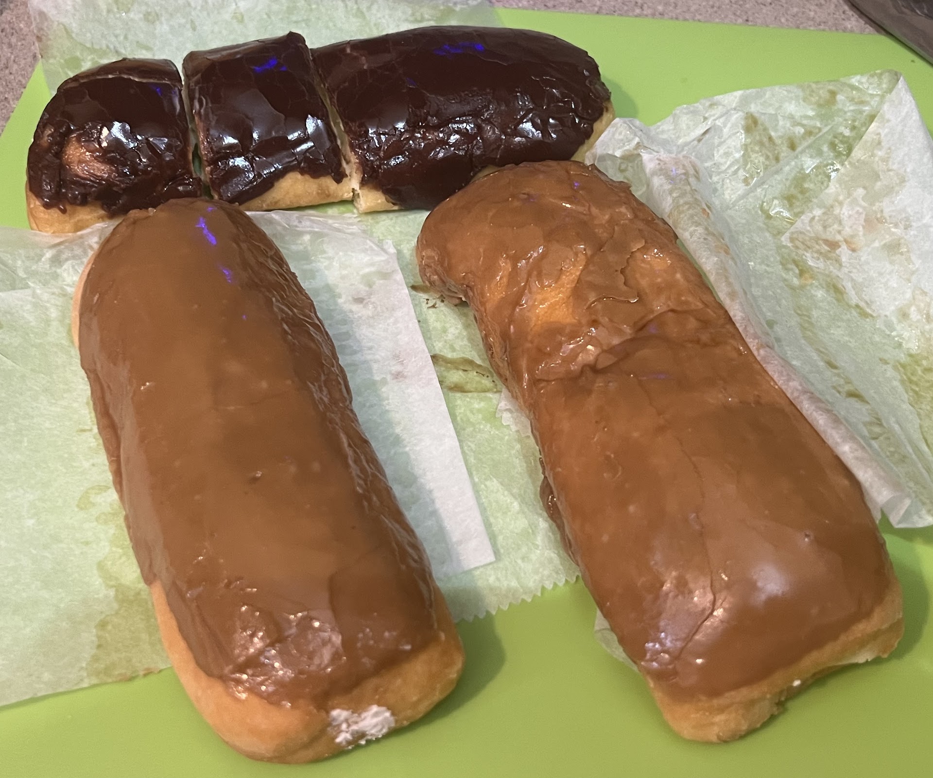 Maple glazed long john with angel cream filling. Maple glazed long john with cream cheese filling. Chocolate glazed long john with...