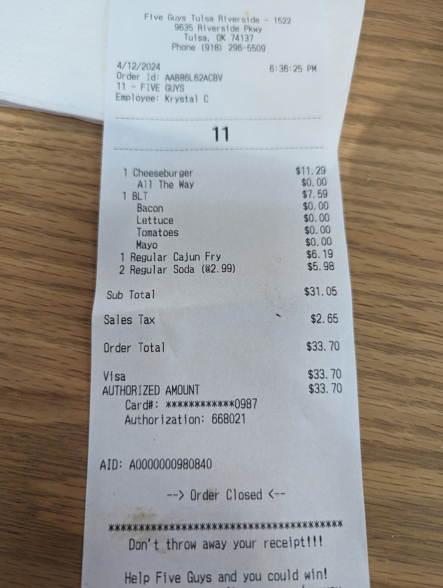 Read moreI've been to this Five Guys location a few times now. Always for dinner on a weekday. The location has never been busy when I've been in. Therefore, no line and minimal wait. Given different work staff - the burgers have been always good, but my last visit they were great. We ordered cheeseburgers (1 bacon, 1 just cheese) and a large fry to share and got enough fries to feed 4 people! The burgers are always cooked well here. I saw a review saying the bacon was not good....I have found sometimes the burger fixins here are only OK. Never bad, but other times they are excellent. I figure that's due to the vagaries of a chain restaurant. This place has been clean every time I have visited. Most recently, it was very clean. This is a well-run location (Fall, 2024) serving up great burgers and fries. For Tulsa burger fans, my recent (Fall, 2024) experiences leave me to say that (for me) Five Guys is preferred over Fat Guys. And I'm a Fat Guys fan. 4 stars because the food is always 4 or 5 stars and it can get a bit steep on price for 'just...