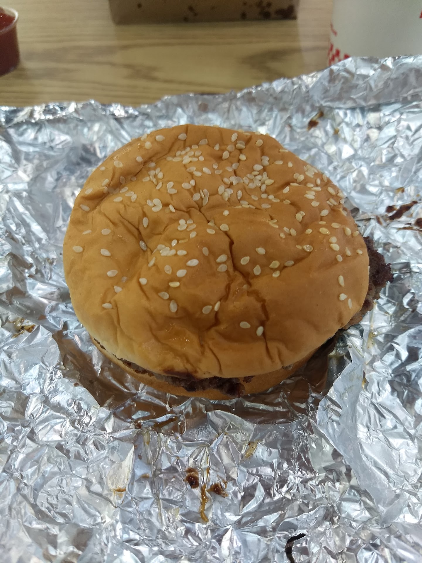 Read moreHusband and I took a walk this evening and wound up over here for dinner. We have never been to Five Guys before. I do not eat cow so there was one true option - the BLT. My husband ordered the Cheeseburger - All the way with every topping. We decided to share a regular order of Cajun fries. Our order arrived in a paper bag with grease soaked through. He was extremely excited to open up his foil wrapped double stacked cheesy cow burger. The fries were crammed into a small cup and there were bonus fries that covered the bottom third of the paper sack. I unwrapped my foiled sandwhich to examine what a Five Guys BLT looks like. It was served on a round seasame bun, layered with oodles of layers of crunchy bacon, slathered in mayo, tomato, and some lettuce. The bacon was over cooked to a crisp - like dog treats. Couldn't complain too much - it was a thickly stacked helping of bacon for $7.50. Fries were satisfactory - looked like the authentic cut and fried potatoes tossed around in Tony C's seasoning. Husband was pleased with his cheeseburger. The price was okay..... Wish for more non-cow options and maybe some ranch to go with the fries. Would love to try a...