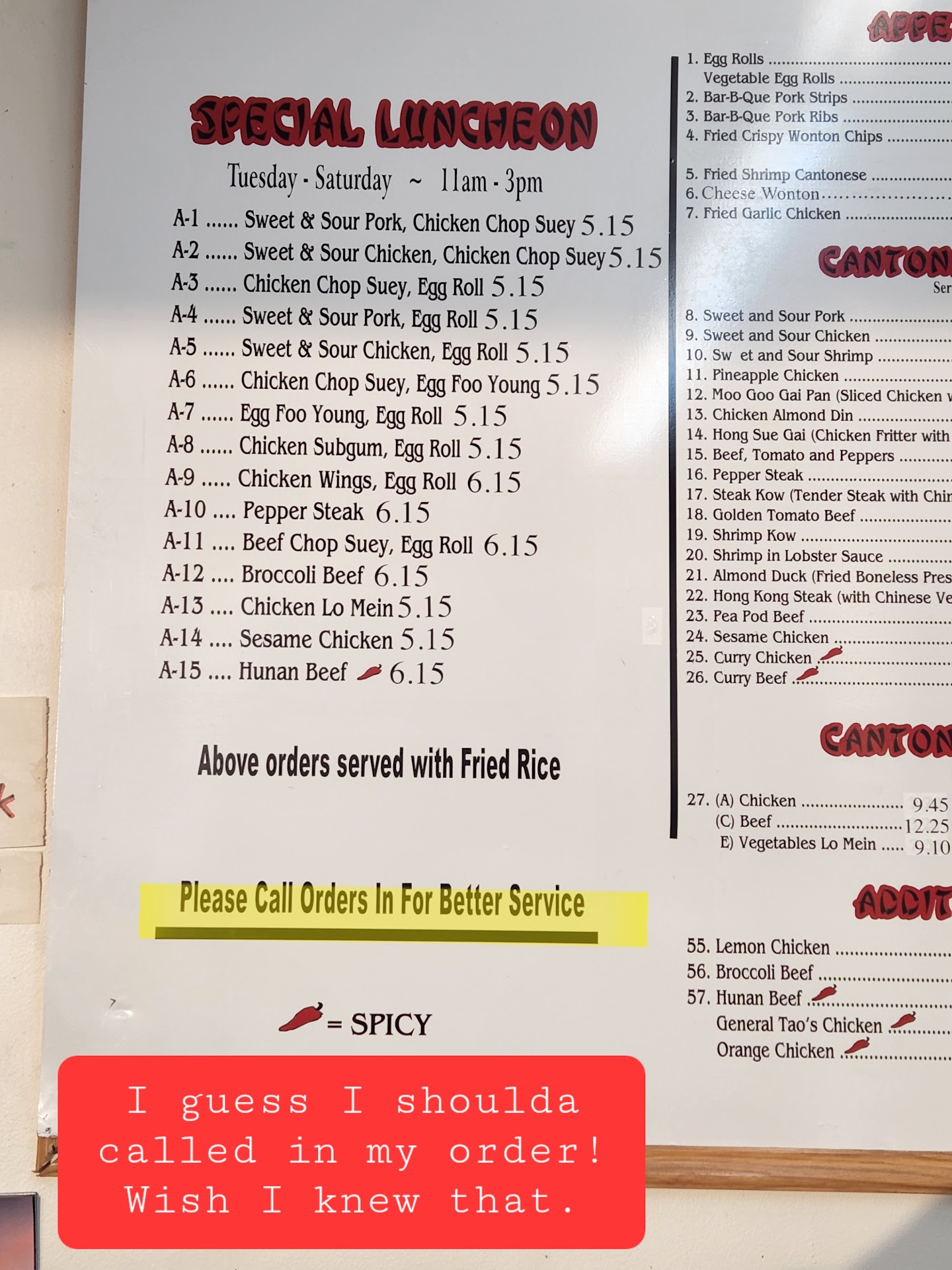 Read moreMade a call in order expecting to pay the prices that were posted on the online menu. Absolutely not the case...all I ordered was two small sides and a simple order of cheese wontons ordered small order of $7 and was charged 15 and some change when getting there and was told no that's what you ordered over the phone. Not to mention the woman was rude never asked my name when I got there asked me what was on my order and again told me whenever I asked why my total was so high she said to me that's what you order. Will not ever be going back there again first time and last...