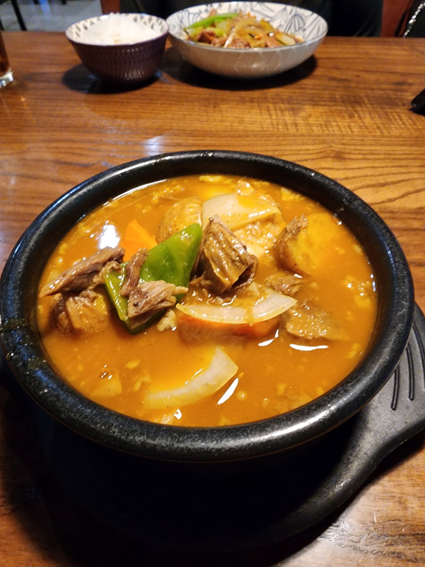 Now, onto my curry beef tendon. I didn't realize it was going to be a soup, but I like trying new dishes, so I was still all for it. Honestly, it gave me pot roast vibes with an Asian flare. The beef was very tender, melt in your mouth, and took on the flavor of the soup. It came with th8n sliced carrots, slivers of onion, and small potatoes halved . The broth had a good subtle curry undertone with a soup like consistency rather than being thicker like a Thai or Indian curry.