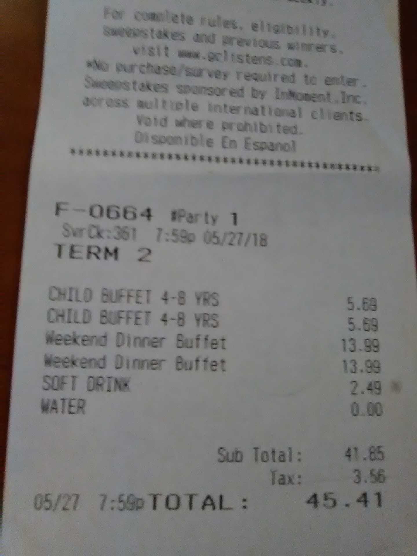 Read moreNow that they eliminated Furrs cafeteria, Old Country Buffet, Ryans, Western Sizzlin, Lubys, Bishops, & others they have become an oligarchy or monopoly here in Tulsa. Their food is bland and seems like the kind of stuff you would get in the military or prison. They have dumbed down their menu & quality with no longer any quality fish or turkey generally on the menu such as Salmon. When they serve steaks it is poor quality beef in my view. If you get takeout food, they want $10 bucks a pound, which in that small plastic tray can add up to almost $40 bucks----a total ripoff in my view if you getting takeout food. The 71st street location is the worst---it's crowded & on weekends & popular days can appear to be packed well beyond their occupancy level permit as people jockey to get to the mash potatoes. Lousy experience which makes you want just take out, but the cost of takeout grub for this lousy food is $10 a pound. Pray for other buffet venues to come to Tulsa. because the food here is awful & expensive, particularly for takeout food. This GC has the toughest poorest quality meat or steaks I have ever seen. They apparently have a new owner and the mgmt. is obsessed with food costs. The food is terrible and main items on buffet are consistently left empty such as the tray with the cheap "roast" usually mostly has only potatoes & carrots with...