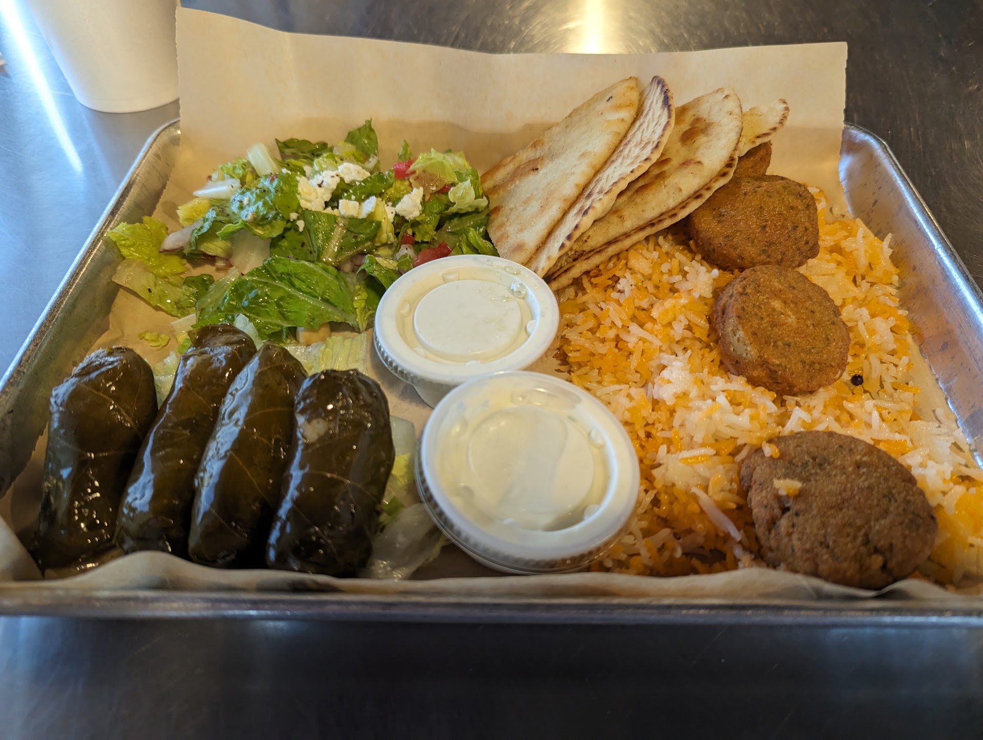 In order from my least favorite to most favorite thing on my plate: Greek Salad - nice little side, I enjoyed the chick peas which you don't usually get in a more traditional Greek salad. Pita bread - toasted to perfection, a little color to make it slightly crisp, but still soft in the middle. The rice - no idea what kind of rice blend this was, it was delicious, I noticed a few peppercorns but no idea what the other flavors were, it was so good! Grape leaves - so happy I added this on to my meal. Fresh, stuffed perfectly. They didn't fall apart. Glad they were vegetarian. Tzatziki - so good, I've never met a tzatziki I didn't like, but this was better than most. Falafel - best I've had. The patty shape and size and breading was almost like a deep fried fair treat of some kind. Like a fritter or something. I loved the texture, slight chewy, very soft inside but a crunchy crust. The flavor was top notch. I loved this meal and can't wait to come back.