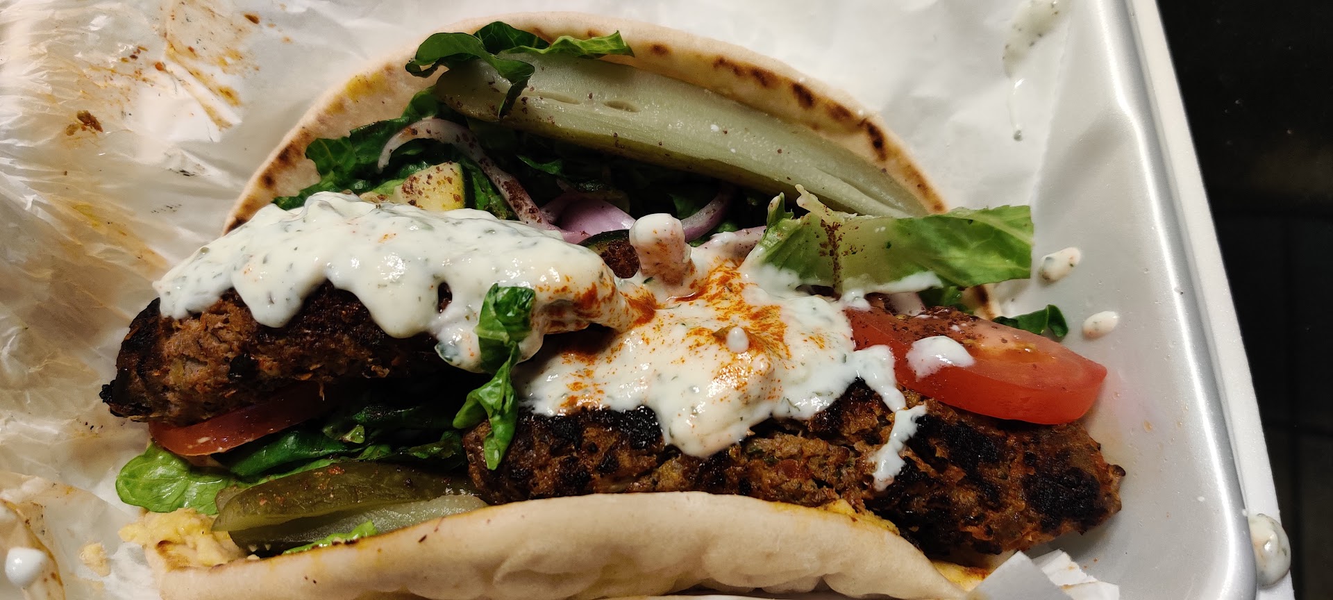 Kafta kabob sandwich was very good. The vegetables were fresh and the kafta kabob meat was amazing. This is what I look for in Mediterranean food. A strong spicy punch full of flavor wonderfully contrasted by the cool tzatziki sauce.