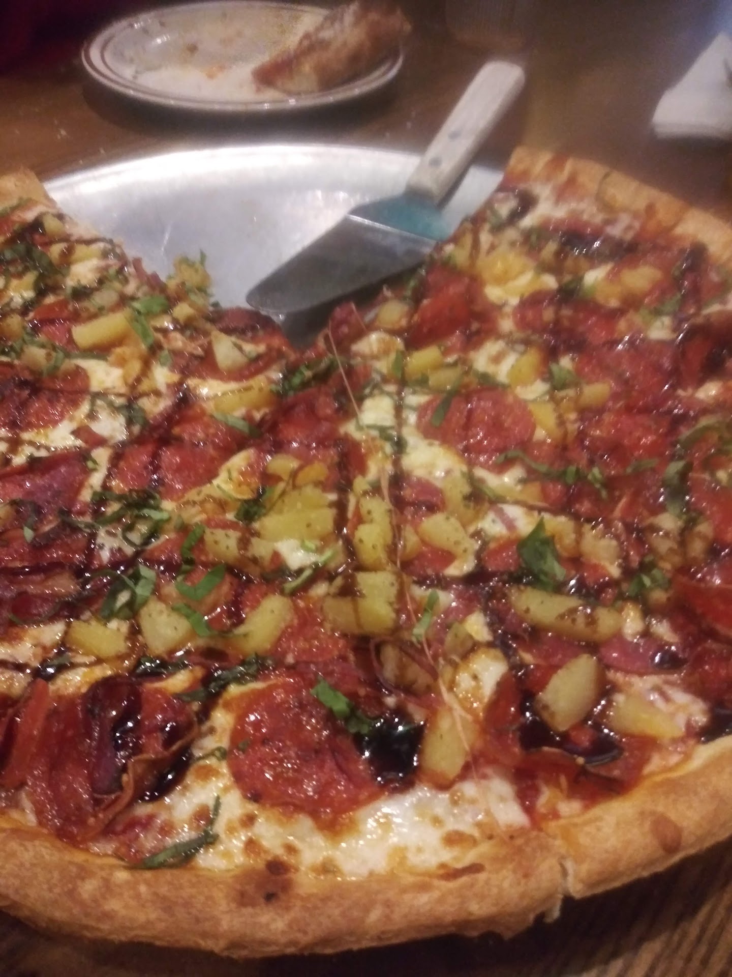 Read moreLet me start by saying that we arrived at 6:37 and left at 9:30 and not because we were visiting. We had a large group and it took a while to get seated. The manager was very nice and kept us informed on the status of our table. We finally got a table and everything started off well. We got our drinks and an appetizer pretty quick but then things fell apart. Other members of our group ordered an appetizer but it didn't come. Several of us ordered salads and they didn't come. Finally the waitress came back and said she forgot to press send when she entered the order. Then the manager came and said the ticket for our salads had fallen behind the printer so he comped them. The salads finally came and were followed closely by our food. Most of liked our food. The large pizza we ordered seemed a lot smaller than it usually is but it tasted good. It might be a case of shrinkflation. My son ordered the kids alfredo pasta but he did not like it. The waitress tried to talk us into ordering the adult size but I'm glad we didn't because he didn't eat all of it. My daughter got the kids Mac and Cheese. We were charged for my kid's drinks and the menu says kids meals come with a drink. I asked the waitress and she said she charged for their drinks because she didn't know they were going to order off of the kids menu. They clearly had kid's menus sitting in front of them. She didn't seem happy about it UT she finally took them off the ticket. It was overall a...