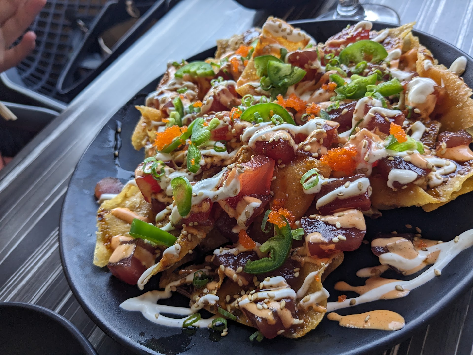 How does this place stay in business?! The only redeeming quality this place has is the view. I had a gift card, so my husband and I decided to use it toward a date night. When we arrived, we were seated promptly, but our server took several minutes to greet us and take our drink order. Our table wasnât level, so it was constantly bouncing up and down. I ordered a French 75 and my husband had an old fashioned- both were average. It took at least 15 minutes for our drinks to arrive. Our server didnât ever come around to check on us or update us on the wait for our drinks. We had already put in our food order; which consisted of 4 rolls. During our long wait, we noticed the tables around us that were seated after us received their food. Half way through our wait time, our server came by after a long absence and informed us that sushi orders were running behind schedule and seemed apologetic but didnât offer to make it right in any way. Meanwhile, the surrounding tables had already finished their food. It took an hour from when we were seated until our food arrived. Our rolls were so disappointing. They were warm, so everything fell apart when picked up with chopsticks. We ordered the high rollers combo and added a ginger roll. One of the rolls was drowned in sauce which made it that much more unappealing. Flavors of the rolls were underwhelming. We did not finish our food and only ate it because we were so hungry. Our bill was $119 without tip. Even with a $50 gift card, we paid almost $90 for absolute garbage. Donât bother with this place; Iâm pretty sure you can get better sushi at the...
