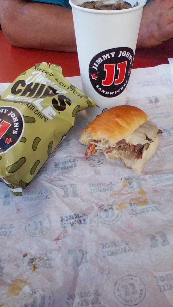 Bags of chips and two premium sides, a pasta and potato salad are available. Soft drinks, an energy drink, lemonade and bottled water are the beverage choices. Three cookies from homemade recipes are also an option if you want something sweet: Triple chip chocolate chunk, oatmeal raisin and fudge chocolate. Plenty of seating. The tables all have amusing comments on their tops such as the do's and don'ts of eating at Jimmy John's in terms of etiquette. (See my photos)