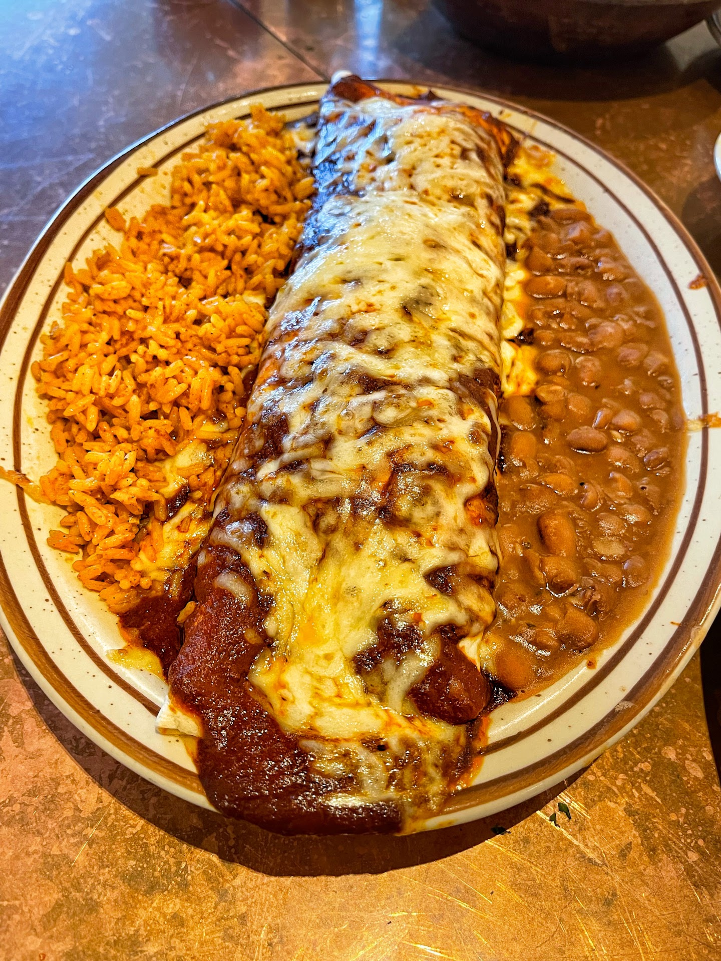 The ribeye, cooked to a perfect medium-rare, was served on a hot plate, maintaining the temperature well. The fusion of Swiss cheese, green chili stew, and tender beef was heavenly, with nutty Swiss cheese followed by smoky, spicy green chili, and finishing with rich ribeye flavors. The Spanish rice had a nice spicy aftertaste, possibly from TajĂn, but the pinto beans were bland and underwhelming.
