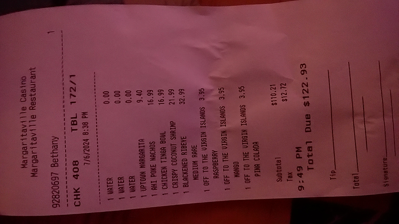 Read moreIf I could rate this zero stars, I would. My husband and I, along with a group of friends were very disappointed and honestly disgusted with our experience at Margaritaville Tulsa. Pool side was wonderful. Our group of 8 spent 3 hours in the pool. My husband, a grown adult, had three beers in that time period. We decided to head to dinner at Margaritaville. Our large party was seated and we ordered drinks. The waitress would not allow my husband to order a beer and quickly got her manager. “Manager Spencer” came to our table and told us that he observed us in the pool and made the decision that my husband was too intoxicated to be served another beverage. We asked what exactly he observed and he would not give us an answer, just “based on my training”. We asked to speak to another manager. He said he was it. There was nobody else we could speak to. He proceeded to tell us that if anyone in our party gave my husband a beer, we would be thrown out. He also said he has notified the rest of the restaurants in the hotel/casino and they would not serve my husband either. The way that man spoke to myself, my husband, and our friends was atrocious. Had he pulled our card, he would have seen that my husband had 3 beers in 3hrs. We ended up walking out of the restaurant, being followed by security guards as if we were criminals. I walked strait to the hotel desk and spoke to a manager who just shook his head. He himself walked us to the Fireside Grill where we had an awesome dinner and DRINKS. Margaritaville lost out on a big dinner ticket, and our business from...