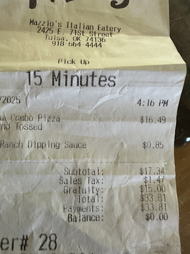 7/26/2025 I ordered a medium supreme pizza. $16.50. Little high. But a solid pizza no doubt. Next day I look at my statement, I was charged $33. An employee added a $15 tip without my consent. They have a drive thru window, I believe I tipped $2. I could’ve not tipped. Not $15. 7/27/2025 I called as soon as I saw the charge and since it was a Sunday I only got the call center, no one was able to resolve it. one of the ladies kept saying “I’m sorry you feel that way” so frustrating. Yet it is a Sunday, I get it. I wait until Monday. 7/28/2025 As of 11 am still no call. I finally get a hold of the store manager and he only offers to refund the $15 that was STOLEN from me. That’s it. Not a couple of free pies. Or even a promise that they would fire that employee who STOLE. It’s like I’m going crazy. A semi local company openly STEALS MONEY and then barely offers to repay it. Insane. After several more phone calls I was graced with my money back(previously mentioned STOLEN MONEY) and a $25 voucher. Wow. Just insane. I expect this from a big chain, but mazz? Come on man. Be better. Be civil. Let’s be real, you’ve gotta soak that stuff in ranch to eat it. Swing and a miss mazzios. What would Ken say?