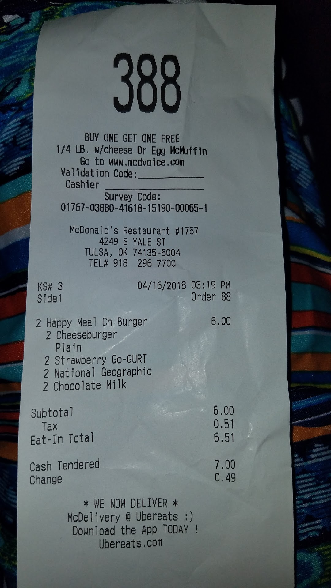 This time the food was hot and fresh. That only happens at a few Mc Donalds in the nearest 50 miles of Tulsa I came at lunch time. However it was staying a little longer that I became unsatisfied. I expected a cleaner play place being in the middle of the city. Their was hair and crumbs in every crevice at least a centimeter thick. Several crushed juice boxes. They didn't sweep in the drop zone the matted area and their is buildup of dirt a couple inches thick arround all the metal poles. Their is no sighns telling kids they need to wear socks. I kept telling my kids to wash their hands and the bathroom in the kids play area was occupied so my 5 year old ran quickly to the inside bathroom not thinking to put on his shoes. I has a run in with the floor manager comming from arround the counter to disipline my son HERSELF! And to tell me I had to leave because he didn't have shoes on for the brief moment he was in the lobby. Their was other kids comming in and out constantly with no shoes and that was ok. It was just my kid she had a problem with. I was in the process of telling my son that he had to help carry things and clean up when the manager came up to us in the play area so I left a mess that she caused by upsetting a customer that has already had it with Mc Donalds. Now they can have a reason to clean up. I'm tired of my family getting sick from eating in the lobby. Its not worth the play place even in the heat of the summer or the cold of winter. When it comes down to it it dosent save any money because medical bills are very expensive and yes it is very loud. Even without kids the vents in thay room are making a terrible screeching noise and then everything else gets amped up over that. Their are better safer cleaner and more friendlier places to...
