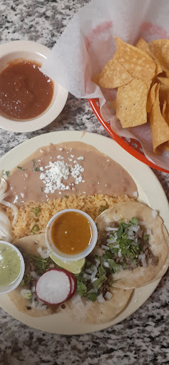It's a small restaurant hidden I a tiny shopping center but the food is amazing! It's also not in the best part of town but I've never heard of anything criminal happening there and I lived close by for over 7 years. I wish I had discovered this restaurant years ago! This is the 3 taco with rice and bean lunch special which alone is only $6.99. I normally order to go but decided to sit and eat there. I was happy to find out that when you eat in the restaurant you get served fresh tortilla chips with 2 kinds of salsa. One is red the other is green the salsa I got with my meal made a third kind of salsa. All 3 were wonderful! Very authentic...