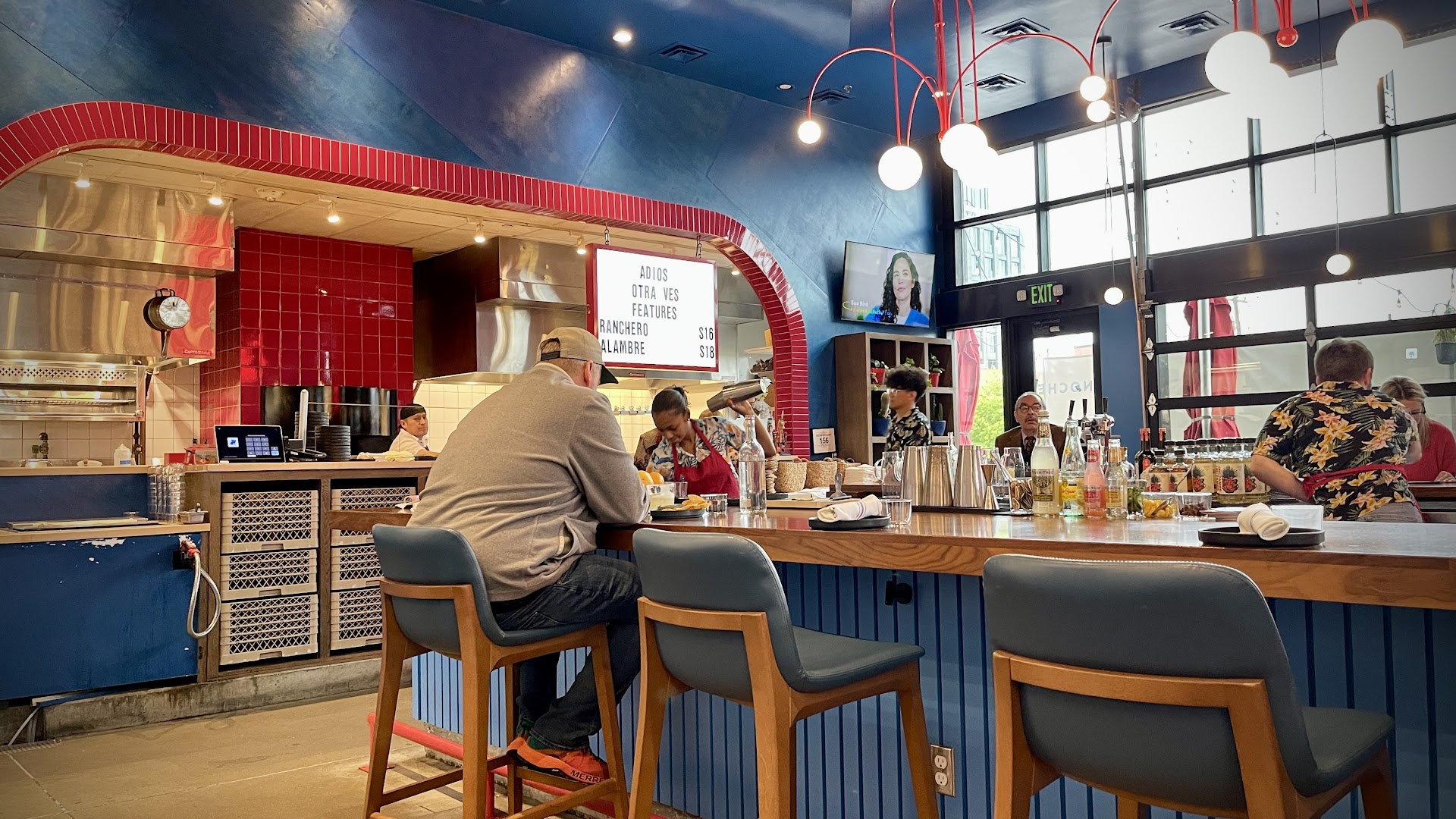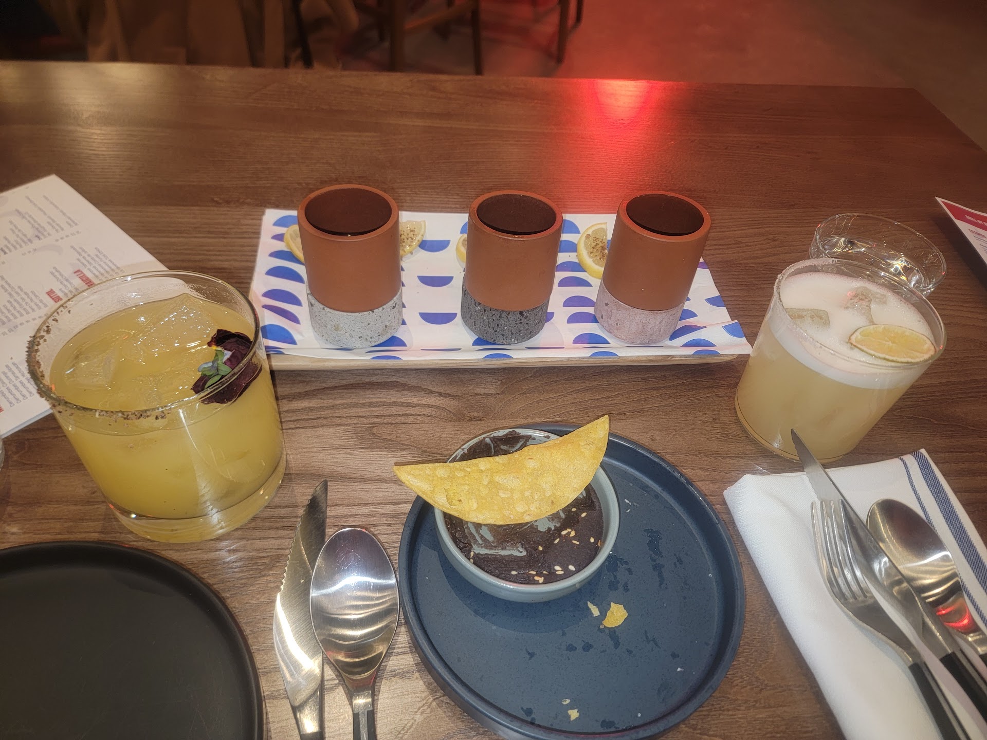 I made a reservation online and all that was available was a 7:45 high-top and I noted that we may prefer to sit at the bar if there was an opening when we arrived. There was, so we sat at the bar, but there was a booth open and they were very accommodating to move us to the booth. As soon as we sat down with the bean dip and chip starter (which was a nice change from chips and salsa), our server immediately asked for our drink order and tried to get an appetizer going. We hadn't even looked at the menu, so we asked for a minute. We ordered the mango habanero margarita and the Classic Margarita with egg white (nice!) and a tequila flight. The bartender brought the tequila flight and told us what they were - I have seen pictures of the pairings and maybe those are the mezcal or more expensive one, but they're paired with different things, ours were all just paired with lemon slices dipped in tajin salt and we weren't told why it was lemons - I thought they had maybe run out of limes or were just trying to be different. Our margaritas came and again, we were asked if we were ready to order so fine yeah let's uh get guacamole and queso that they can't do without meat in it so feeling rushed again, haven't even tried our drinks. Apps come out in what feels like not even 10 seconds but might have been 2 minutes. Again, are we ready to order? The restaurant is NOT full or busy, but I'm just tired of being rushed, so we order chicken fajitas to share. I'm not joking - they came out in 4 minutes. How do you cook fresh chicken in 4 minutes? We haven't even enjoyed our appetizers. The chicken was fine. It came with grilled onions (and only onions) and one grilled jalapeño, pickled carrots and more onions, sour cream, and a small sprinkling of queso blanco. The tortillas were delightful, though (i would just order those by themselves). The chicken fajitas were fine. Not sure it was a dish that was $30+ fine, but whatever. We ate, paid, and left in under 45 minutes. I always give a restaurant 3 chances, sometimes more, so it could have just been an off night and i will try it again, but probably not for awhile as there was nothing that stood out as fantastic. Maybe lunch & brunch will bring something different to the table. It's a cool space, though, and I know it's new. And we ordered basic things because we felt so uncomfortably rushed we didn't have time to really look at the menu. It was date night. We were trying to enjoy our time together at this cool new place, but we enjoyed ourselves at French Hen next door...