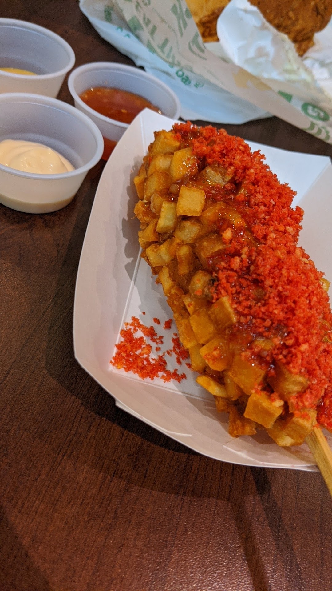 Read moreWe stopped by tonight and got a mozzarella potato corndog with flaming hot Cheetos topping and it was great! The potato had a perfect crunch and it was filled with a ton of stretchy cheese and the Cheetos on top were perfect. We also got a cute strawberry mochi donut with fruity pebbles and a pocky. They had tons of sauces to choose from, and we liked the sweet chili one best. The wait was kind of long and weird and crowded, but overall fine considering it was dinner time.