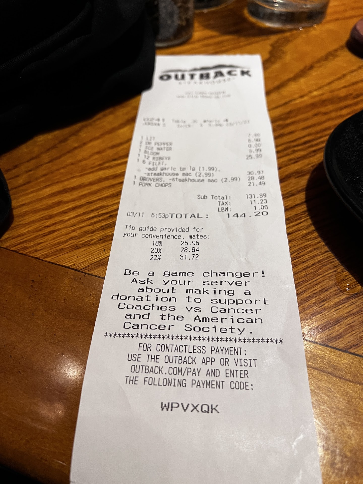 Outback has been one of our favorite places to eat for decades. Our experience at this Outback on Yale in Tulsa was so bad I felt the need to go to the trouble to put this review out there. As you can see from the receipt 4 of us on the ticket for $144. Walked in at 6:05pm on a Saturday and left at 7:40pm! It was already full, but we were seated right away. Our waiter brought drinks right away. Our bloomin onion came out perfect and we placed our order. The place slowly started emptying out as we waited for our food...and we waited. Wish I'd have timed the wait but did not. The lady across from us must have waited 20 minutes for a dessert she had ordered to go. We did get a small apology from our waiter for the delay with no explanation. Our guests did not complain about the food, but ours was definitely not up to par. I ordered pork chops that were so tough I had trouble cutting them up to feed my dogs when I got home. My husband's ribs on his Drover's platter had a wang and were tough too. At this point the waiter was so busy with new customers coming in we were ignored. We had to ask for our ticket and was never asked about refills or drinks to go. I had given the waiter my phone number for the rewards app. When I checked the app I found no way to see if our ticket was applied to my rewards account so I can only assume it was not based on our bad experience. I would caution anyone choosing this location to avoid it and choose another. We will...