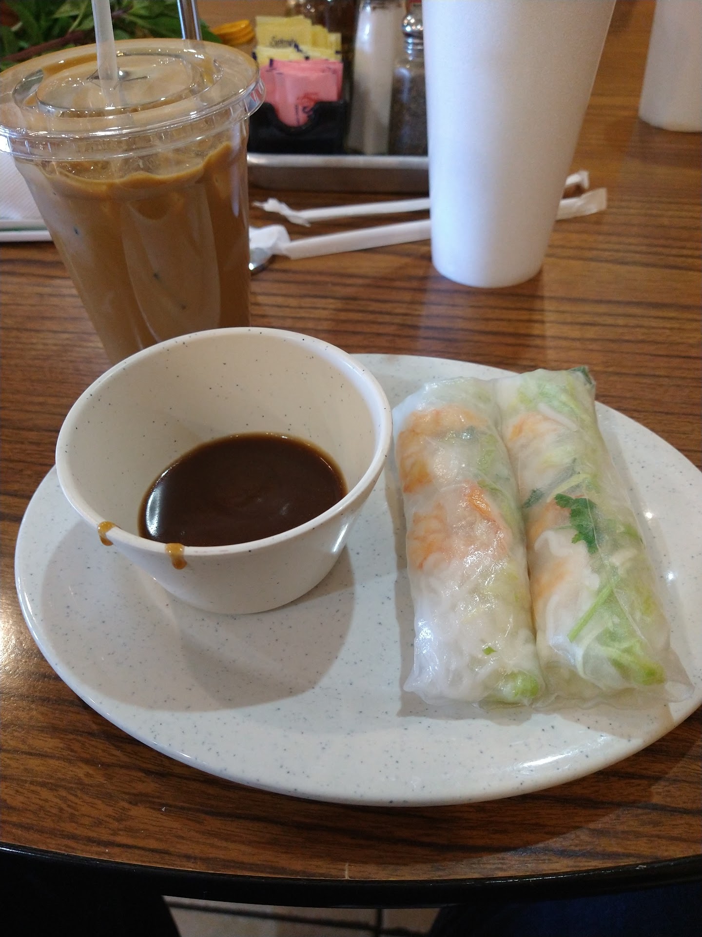We ordered a beef and seafood pho, bun ho hue, pork egg rolls, and spring rolls.