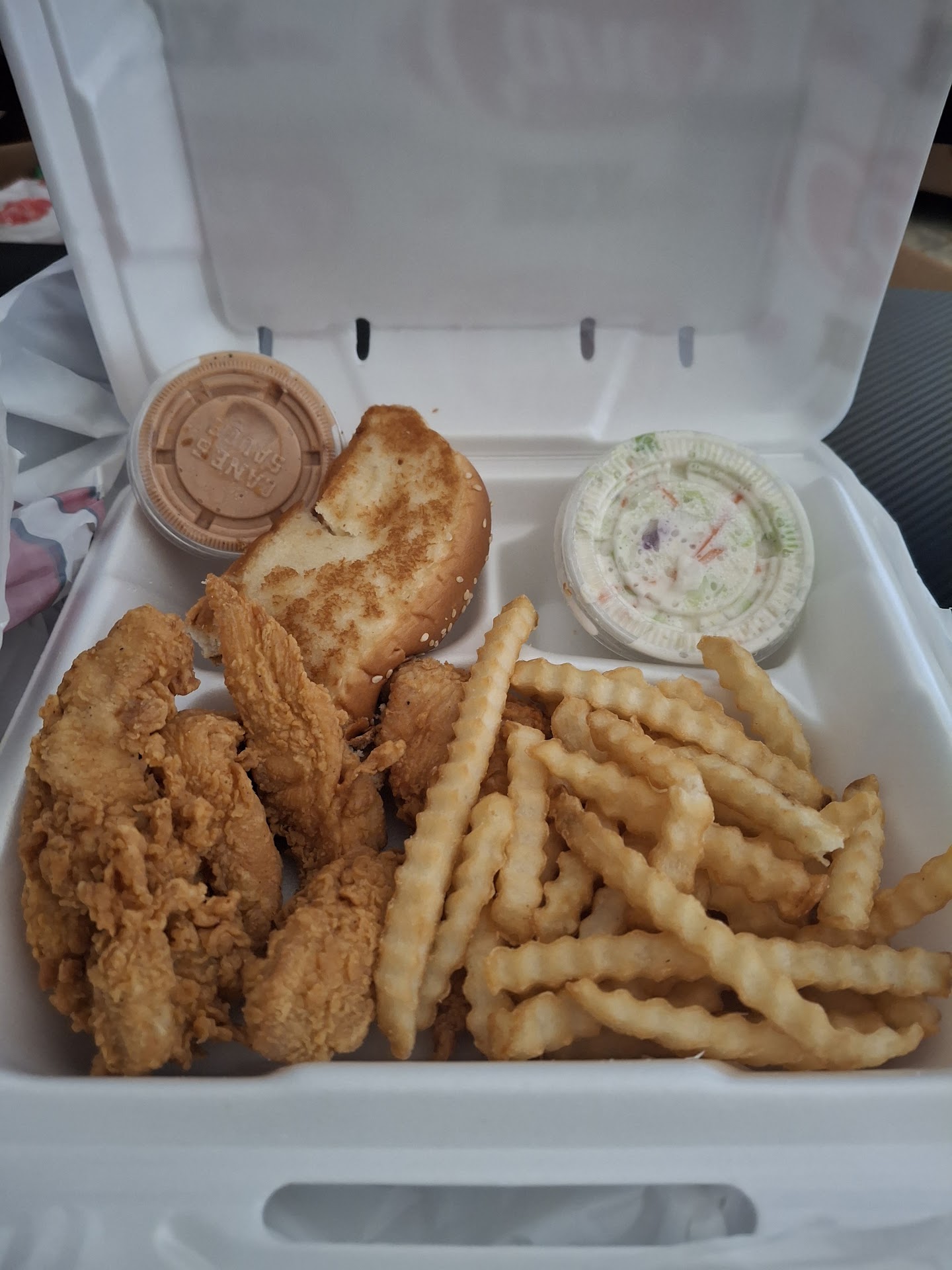 The chicken itself was tender and juicy, albeit not super flavorful by itself. The fries were decently crunchy on the outside and soft on the inside. The cole slaw is nothing special, and the Texas toast is unfortunately bland and soft. The lemonade is a good level of sweetness to be refreshing and cut the savory without being overly sticky or sweet.