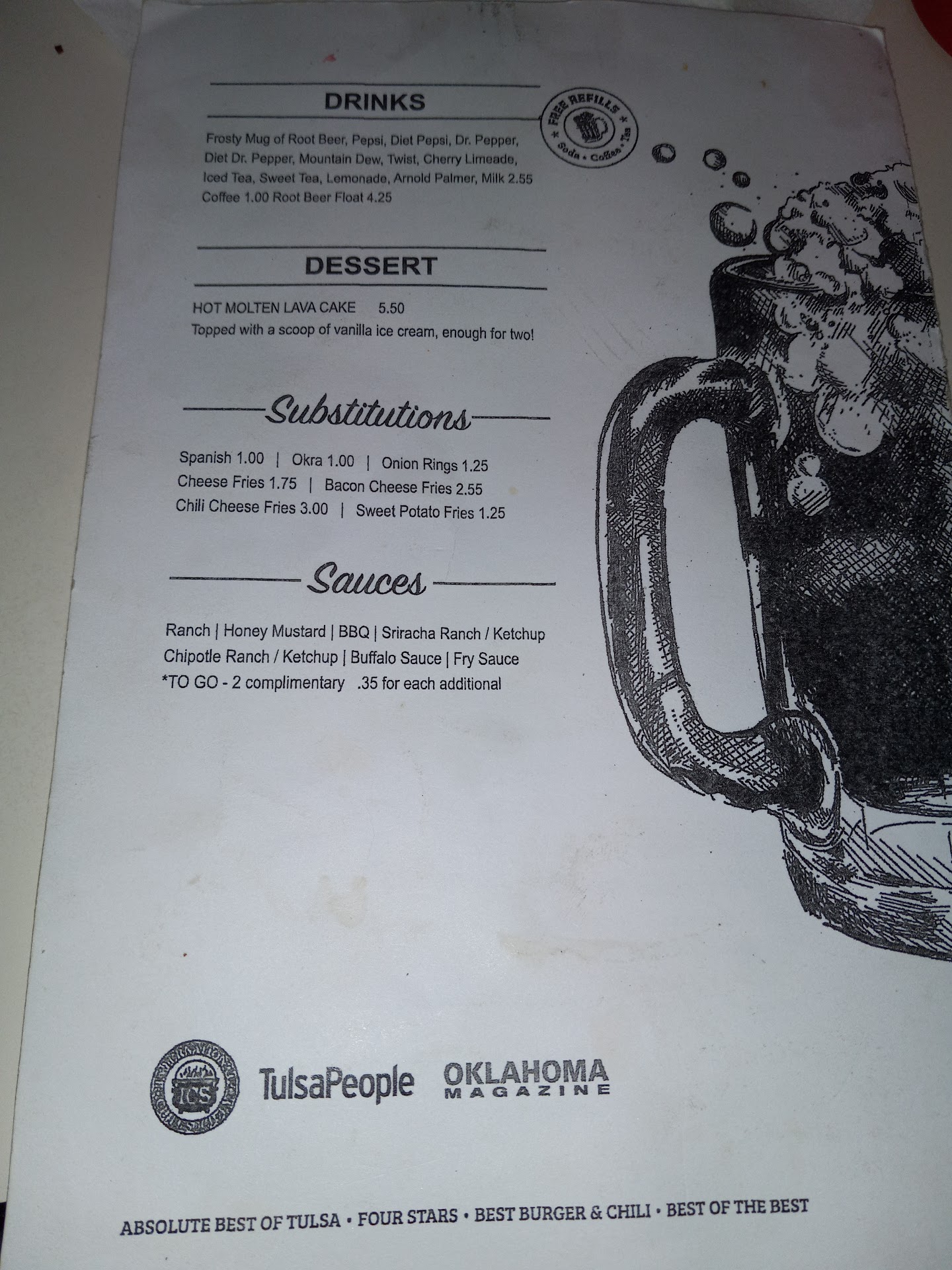 The food was fresh and hot. The wife had a plain hamburger, and I had a smothered chili-cheese burger. We ordered the large fries, they were nice and hot and perfectly cooked, but weren't even close to the amount they give you the Ron's in Broken Arrow. We usually share a large order, and this was less than the small size. We also had fried pickles and they're really good. The service was not very good. The young lady was polite but never came back to refill our drinks or even check if we needed anything. She also started sweeping the floor with a broom and right next to our table. I didn't say anything, but I think she realized based on how I looked that you don't sweep up and kick up floor dust where people are eating.