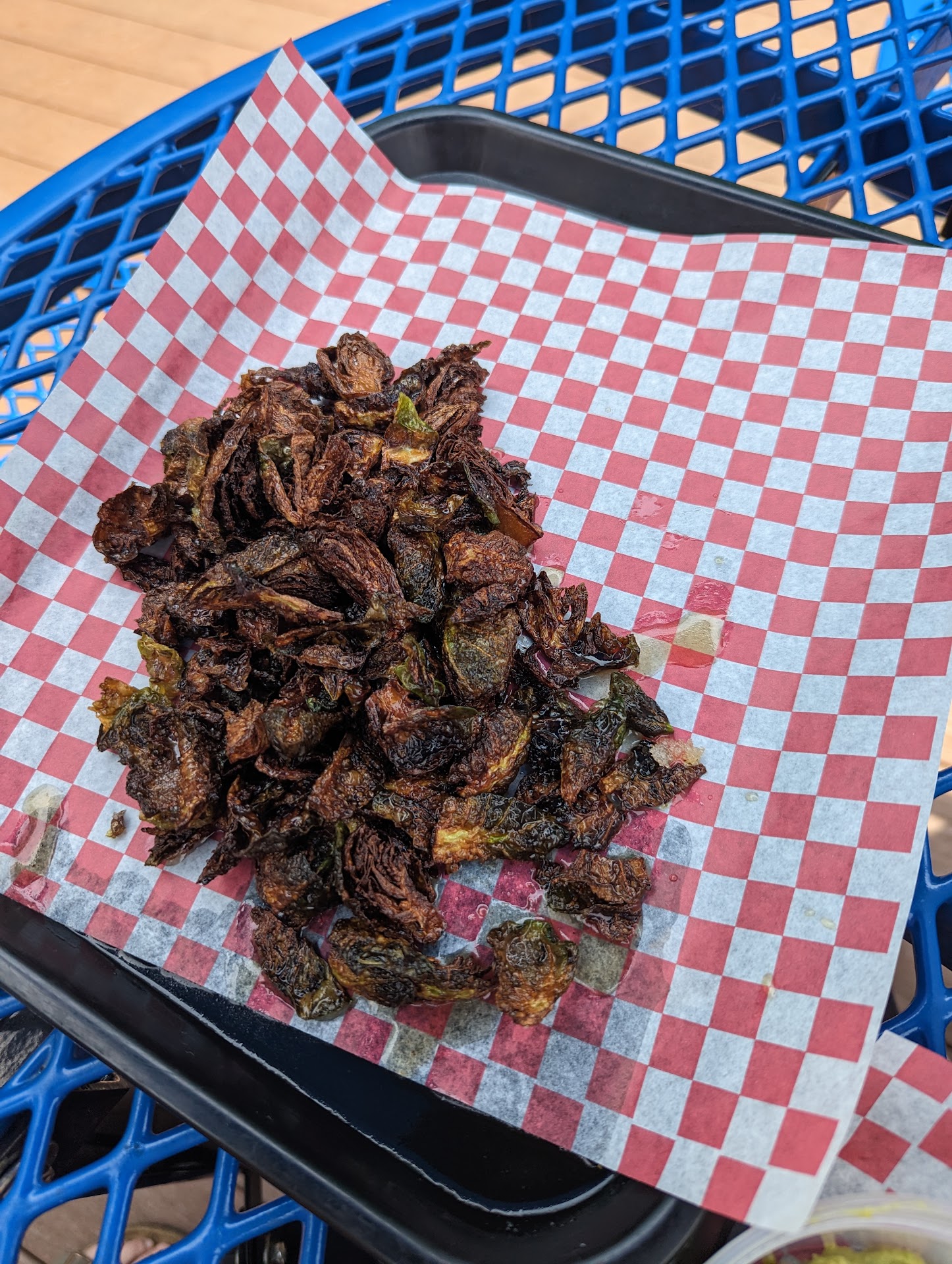 The fried brussel sprouts came out burnt to a crisp and had sugar on them for some reason. The 3 tacos all were incredibly dry. The Elgin park was good, but needs some sort of sauce on it to fight the dryness. The brussel sprout taco was just the same burnt, strangely sweet sprouts and some "slaw" on top of it. The slaw was just apple, radish, and maybe some onion slices all tossed together. There was no real flavor or spice to it, not really slaw like. The mushroom taco was just some rubbery over fried mushroom with way too much of the red salsa on it. Somehow even with the stuff swimming in salsa to the point it was pouring out while trying to take a bite, it was still dry.