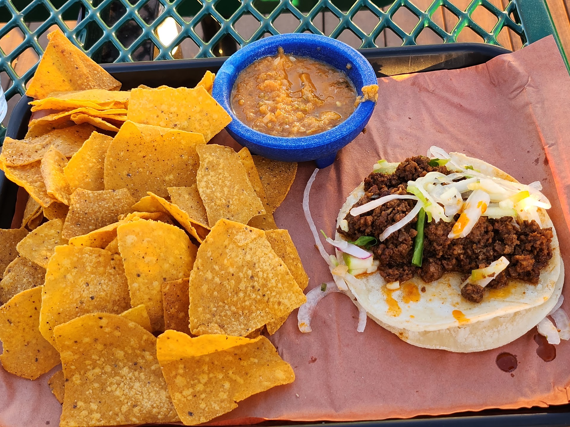 The taco was mediocre. The ground beef didn't have much flavor on it's own, there was a plentiful amount, enough to make two tacos out of one order, but just underwhelming. The green apple slaw was so light, you couldn't taste it. The salsa helped, but not much