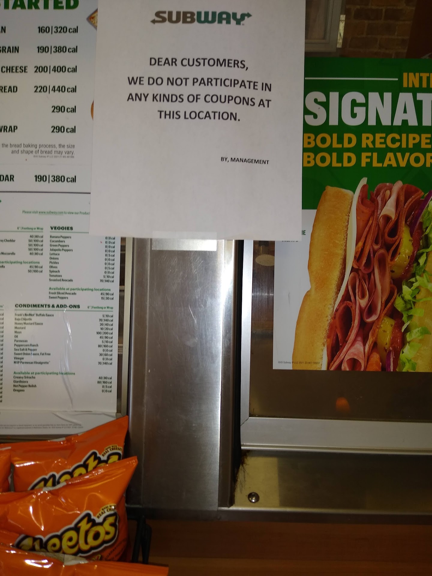 Read moreI’ve never walked out of a subway but the low class individual working the sandwich line changed that today. Walked in to place an order. Lady asked if I had a pickup order. I replied no ma’am I’m going to get a wrap. She reaches in the bread box, starts making a sandwich. Had an extremely rude demeanor, never spoke nor acknowledged I was there after the initial interaction. Another lady was out stocking the drink station. This is not the face I would want serving my business. Thankfully there are many choices for food close so do this establishment a favor and take your business elsewhere...