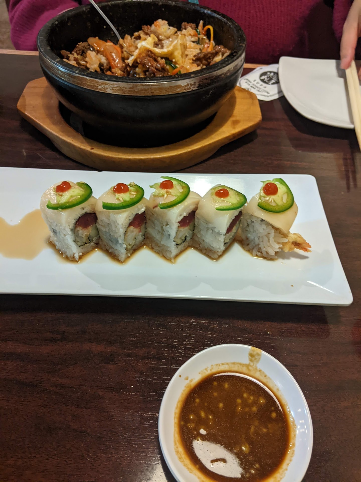 Read moreThe food was great! There were 3 of us (2 adults and a 9 yrs old). We started with Volcano roll and spider roll. Both were excellent. Then we went on to the Korean entres--bulgogi and pork belly sizzling plate (ssam gyup sal gui). The bulgogi is delicious. But I would recommend an appetizer (like sharing a sushi roll) if you are really hungry or a growing man (like my skinny husband). The pork belly sizzling plate was about $3 more than the bulgogi but it was worth every penny. You dip the salty/sesame seed sprinkled pieces of meat in a special Korean sauce and put a little piece of the kimchi or bean sprout from the hot plate with some rice and it's so good. The best way to eat it is to order a side of lettuce leafs, sliced raw jalapenos and extra ssam sauce (all for $3--not on menu--ask for it). Then make tiny lettuce wraps with it. Heaven... my 9 yr old loves it. We all did. The only minor disappointment was the panchan (small plates of Korean pickled vegetables, including kimchi). Not enough variety and too small, but the grilled pork belly came with additional cooked kimchi so...