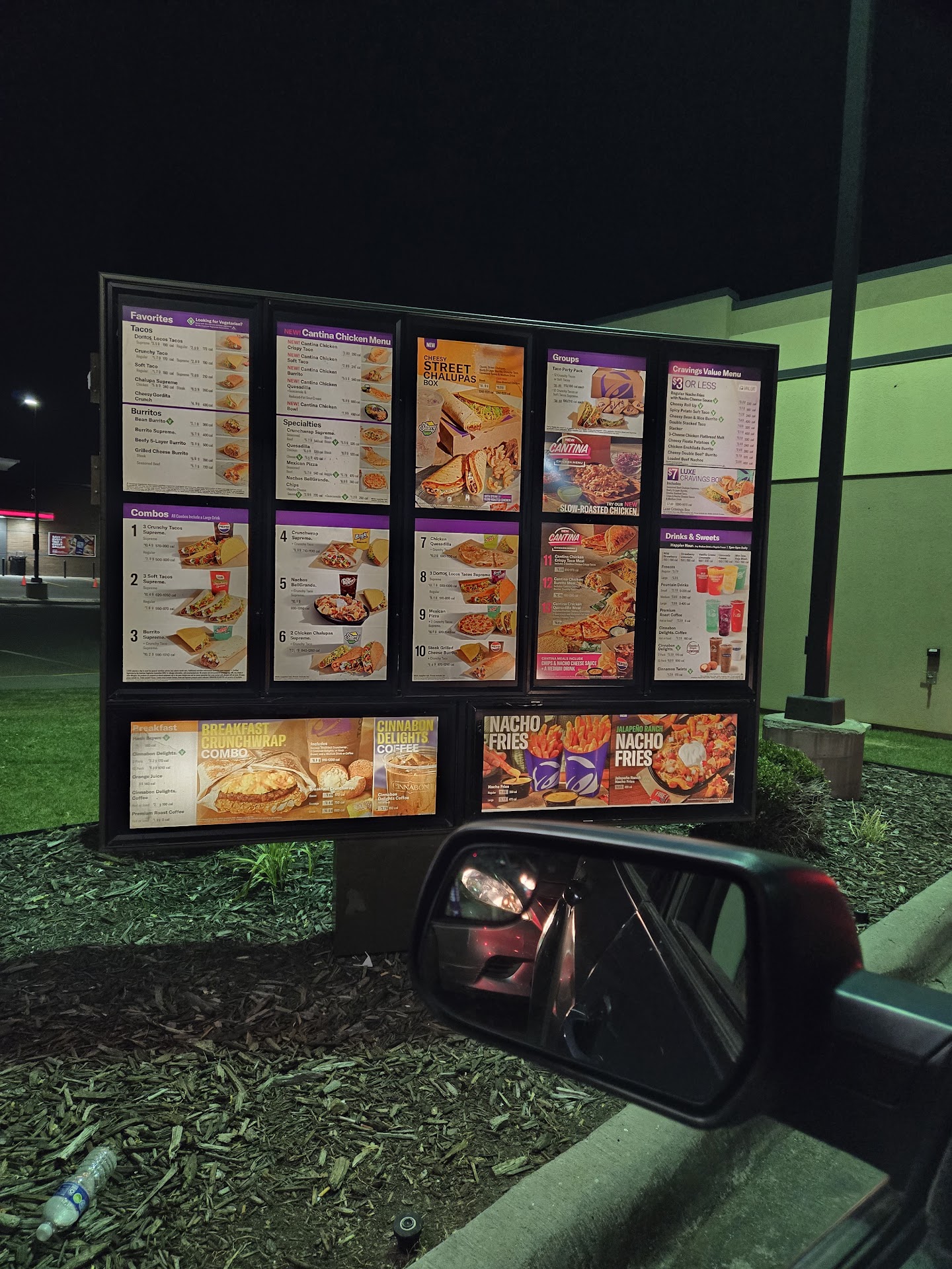 Ā Ā Ā Read moreBad customer service...slow food service... How can it be fast food when I waited about 20 minutes for a Mexican pizza and 2 tacos?? Came in on Sunday even just before 630pm and was the only customer. I went in because there were several cars in the drive thru. Upon walking in not 1 person greeted me or said I'll be with you shortly! After waiting several minutes I finally ordered from the kiosk and waited....and waited. Meanwhile employees were complaining how busy it was and how people must have gotten their taxes because the amounts they were "spending at taco bell" and that they could " buy a weeks worth of groceries" for what they were spending at "taco Bell". I found it very rude and unprofessional. All while still no one acknowledged me . Even after several people walked past me to get cups of ice for drive thru beverage orders (the one behind the counter had run out of ice). The girl running the drive thru speaker kept her back to me the entire time and even after walking in front of me going to the ice machine only said excuse me and still didn't ask regarding my order, say hello or anything. Several other cars pulled into the drive thru, ordered and left all while I'm still waiting...smh. after 15 minutes another girl came to the main register ( first person to even come to the register) asked the name on my order and finally cashed me out. 10 minutes later a young man brought my food up and apologized about the wait. Got there at 625pm and drove off at 643pm. Moral of the story...go through the drive thru. Personally I won't return but I was there getting food for...