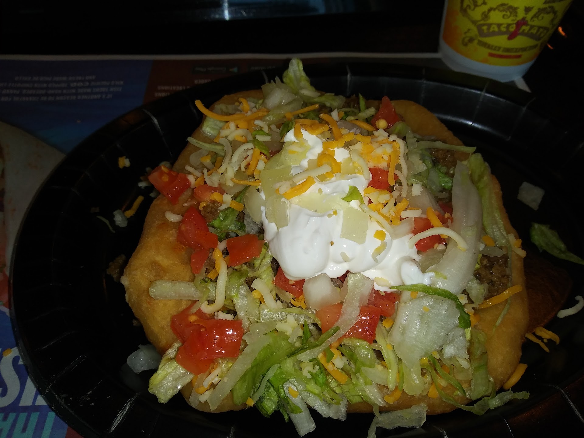 Read moreI came specifically for the Indian taco today because it's Cinco de Mayo. I'll start with the positives. The fry bread was a very nice size and thickness, layered with all of the toppings you'd expect on an Indian taco. The lettuce was nice and crisp and both the lettuce and the tomato were fresh. The beans were the perfect consistency and the taco meat was deliciously flavored without being overpowering. However, I was extremely disappointed in the fry bread because it lacked both flavor and color. It was also not very crispy on the outside or puffy on the inside; it looked more like a tortilla than a piece of fry bread. The grease it was fried in seemed quite old and degenerated. The beans needed a lot more seasoning and attention than they received. I am a cancer patient and rarely eat either fried food or red meat but made an exception for the holiday today. I usually order an ensalada little big bowl with grilled chicken and black beans with a small order of flour tortillas on the side; the portions are quite large and I am able to make two meals out of an order. I will probably not choose to order an Indian taco from Taco Mayo...