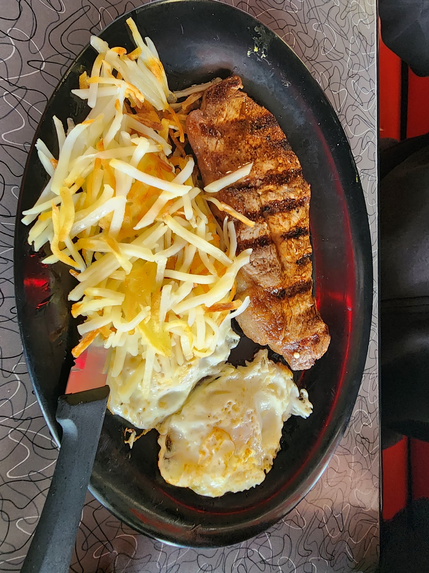 Read moreI ate here for the first time today. The place is cool looking, but it needs a good cleaning. The tables were clean, but the rest was not. There is a Tiffany light in the entrance, but it was not the show piece it should be. The floors were ok, and the bathroom room was pretty stinky. The outside was just as dirty, but it is down town Tulsa, so I have to hold that in perspective. It is located on Historic Rt. 66. The service was wonderful. Her name was Whitni according to the receipt. She was attentive and quick with the refills. She just did a great job. The place does charge a 2% credit card charge so be ready for that. I got the chicken fried steak, eggs, hash browns, eggs with wheat toast. The hash browns were the best part of my dish. The steak had a pile of breading with a smallish hunk of tough unseasoned steak waiting inside. The toast was good, the eggs were ok. My wife got the Avocado toast. It was absolutely delicious. Everything is done just right and had the best balance of flavors. My mother-in-love got two eggs two bacon and biscuit and gravy. It too was done well. The giant cinnamon roll was definitely the star of the show. It is massive and gooey. It is large enough for 4 but 2 can do it if you like cinnamon rolls. The art on the walls create the atmosphere of an old time dinner. The front walk had lots of variety in plants attempting to create a welcoming atmosphere. If I was to base my return on my dish I would not return, but having sampled my wife’s avocado toast, I will give it another try. The cinnamon roll is the icing on the cake, don’t miss this sweet treat delight.