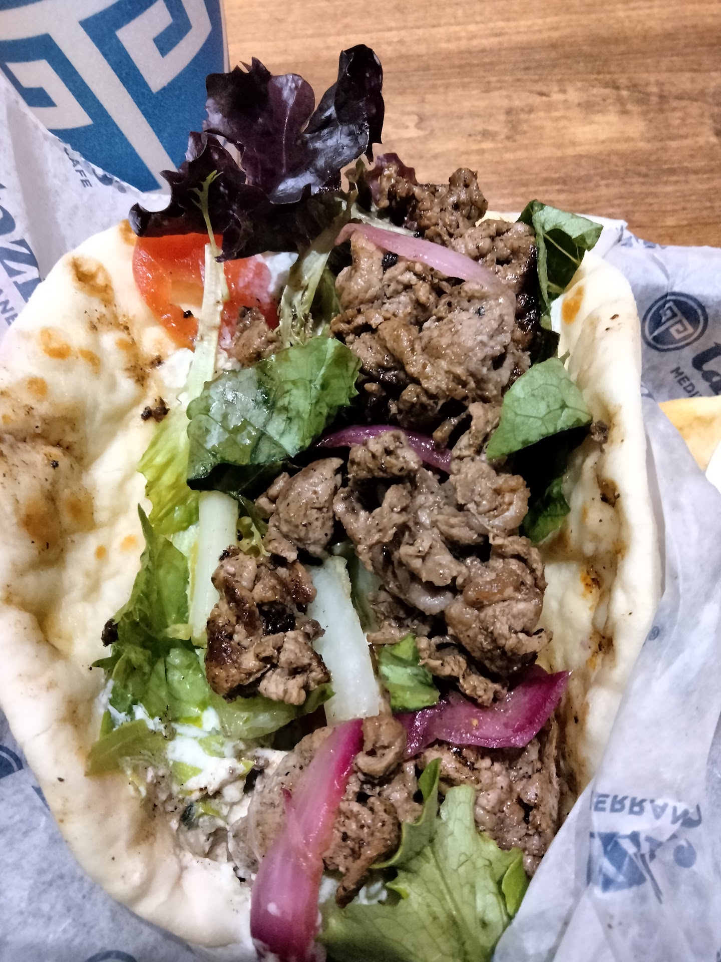Today, my wife and I both had the Greek Salad Bowls. Mine with Spicy Harissa Chicken and my wife had the Grilled Salmon. The chicken was moist, tender with a nice spicy sauce. The chicken had to have been marinated in yogurt, to be that good. The chicken was perfect! I liked the Harissa sauce. It was a good start for spiciness. I found a bottle of “Texas Pete” to give it a little more zip! The salmon on my wife’s salad was good. Likely Atlantic farm raised. The Greek salad under the meats was fair. It didn’t seem as fresh as I would have liked. The tomatoes on mine should have been relieved of their duty last Friday. A good Greek salad needs to be fresh, crisp and loaded. There were a couple of olives, one pepper, a few sprinkles of feta and a small cup of their franchise brand dressing.