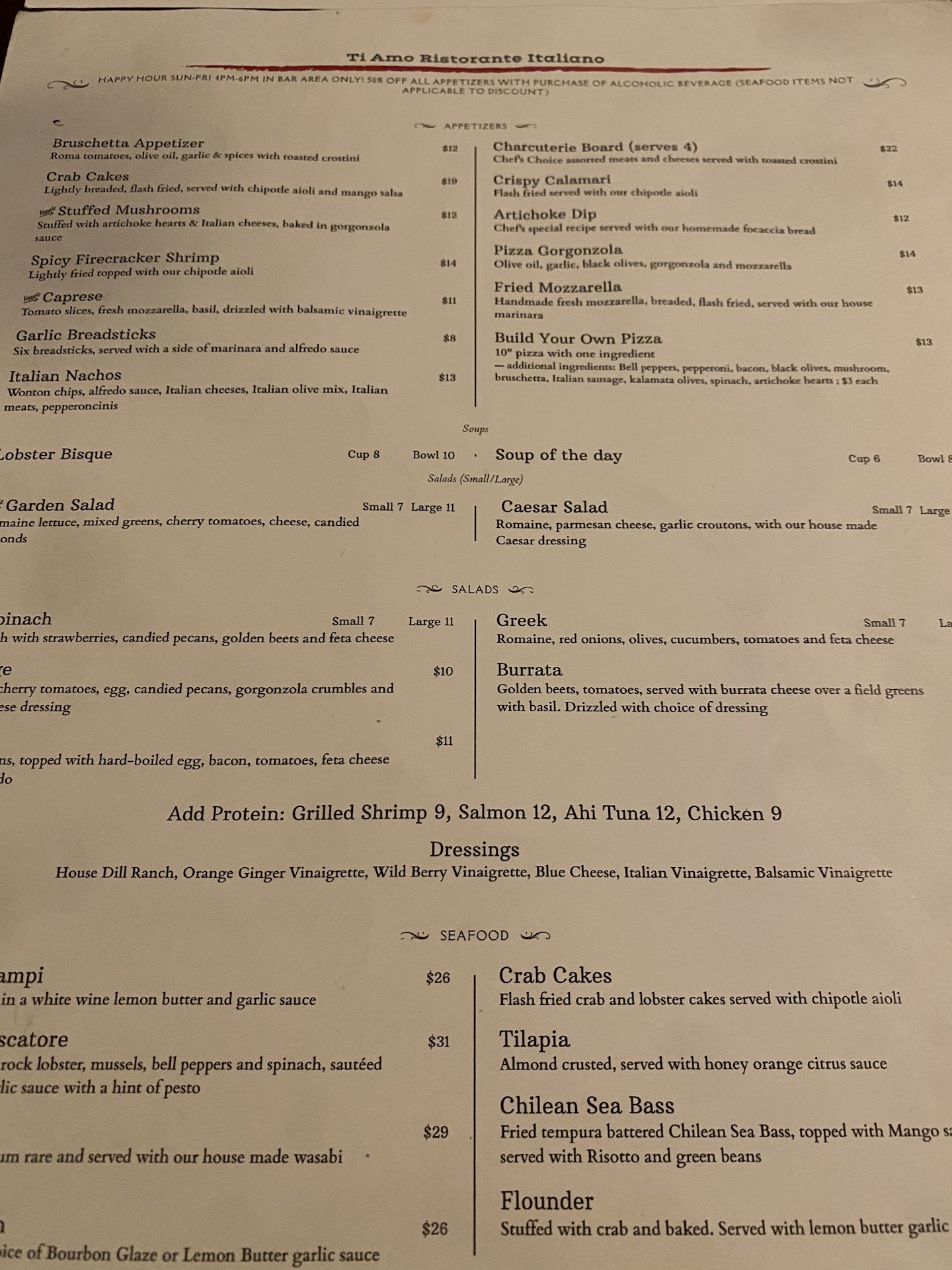 Chef Aziz has been a fixture of Ti Amo, cooking up delicious dining for two decades. And you will always have plenty to eat. Soup or salad and focaccia bread are included with entrees, along with veggies and pasta with most.