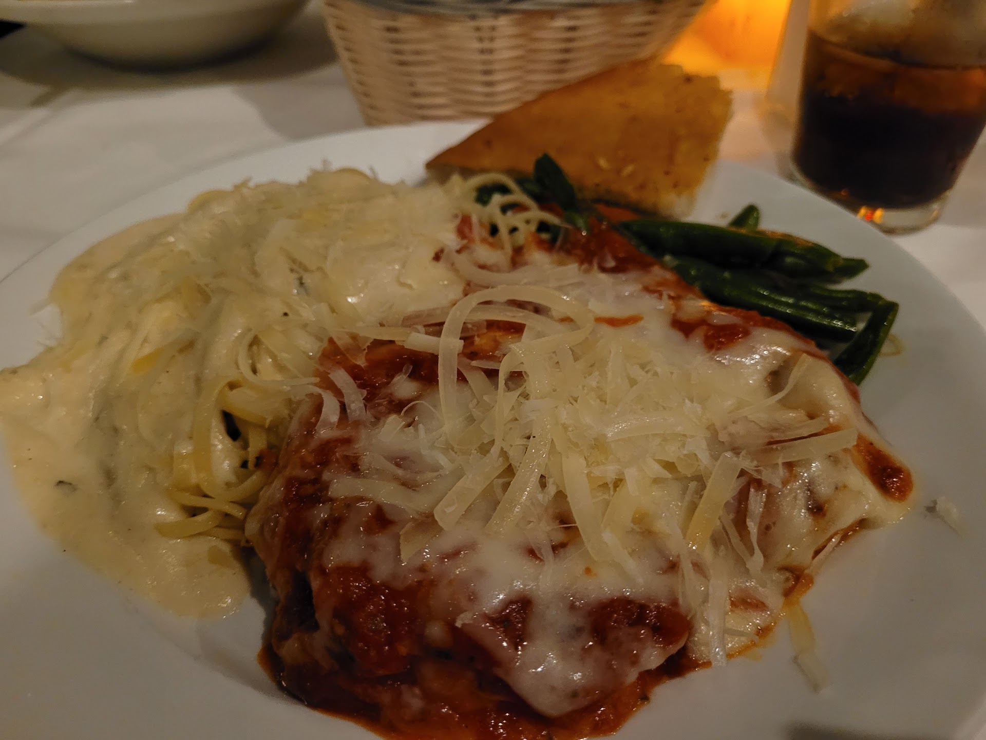 For our main courses, we chose the Pasta Mista and the Veal Alla Parmigiana. The caesar salads we chose as our side were very tasty and worth the three dollar up-charge. It made me question if they made the dressing in-house. We also received a basket of bread, which was very wonderfully seasoned and lightly toasted. Once our food arrived, we dug in. Every flavor was perfection; we were both impressed by the quality of the ingredients we had been served, and the flavors were incredible. We had enough for our meal and leftovers, so it was well worth the price.