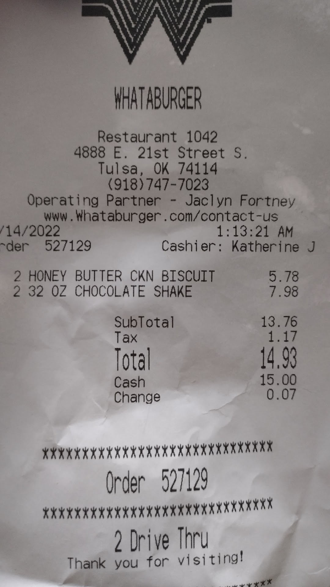 Read moreI am a transplanted Texan and I have a special place in my heart for Whataburger. I've been to many through the years and it seems the Tulsa locations may need some extra training from the Whataburgers in Texas or maybe just some training from any given Chick-Fil-A who know how to do things efficiently and who understand what "customer service" is. Ah...a lost art anymore. Anyway... I usually go to the Whataburger off 41st between Yale and Sheridan but we wanted to give this location at 21st and Yale a shot on Saturday 5/27/23. Our order was promptly taken when we walked in so I had great hope this would be a good experience, receipt shows 10:10am. Simple, easy order, nothing special: 2 sausage taquito combos and a side biscuit & gravy. After we watched 5 vehicles go through the drive-thru with their orders after ours was placed, and after another 2 visitors who came to dine in after us also got their food, I inquired about our order. We finally got it at 10:30 and were told they make it fresh as it's ordered. Not exactly. The taquito tortillas were hard on the ends and had obviously been made much earlier that morning and had been sitting under a heat lamp before they were served. There were several workers, so labor did not seem to be a problem that day as it has been for the past couple of years at so many places. 1 man (the only worker who would actually make eye contact with anyone) was bringing food to people and none were cleaning, sweeping, or wiping dirty tables down during our time there. There are too many places to grab decent fast food and if I wasn't such a Whataburger fan, I'd go as far as to say I wouldn't go back. But, I know I will hold out hope for improvement...