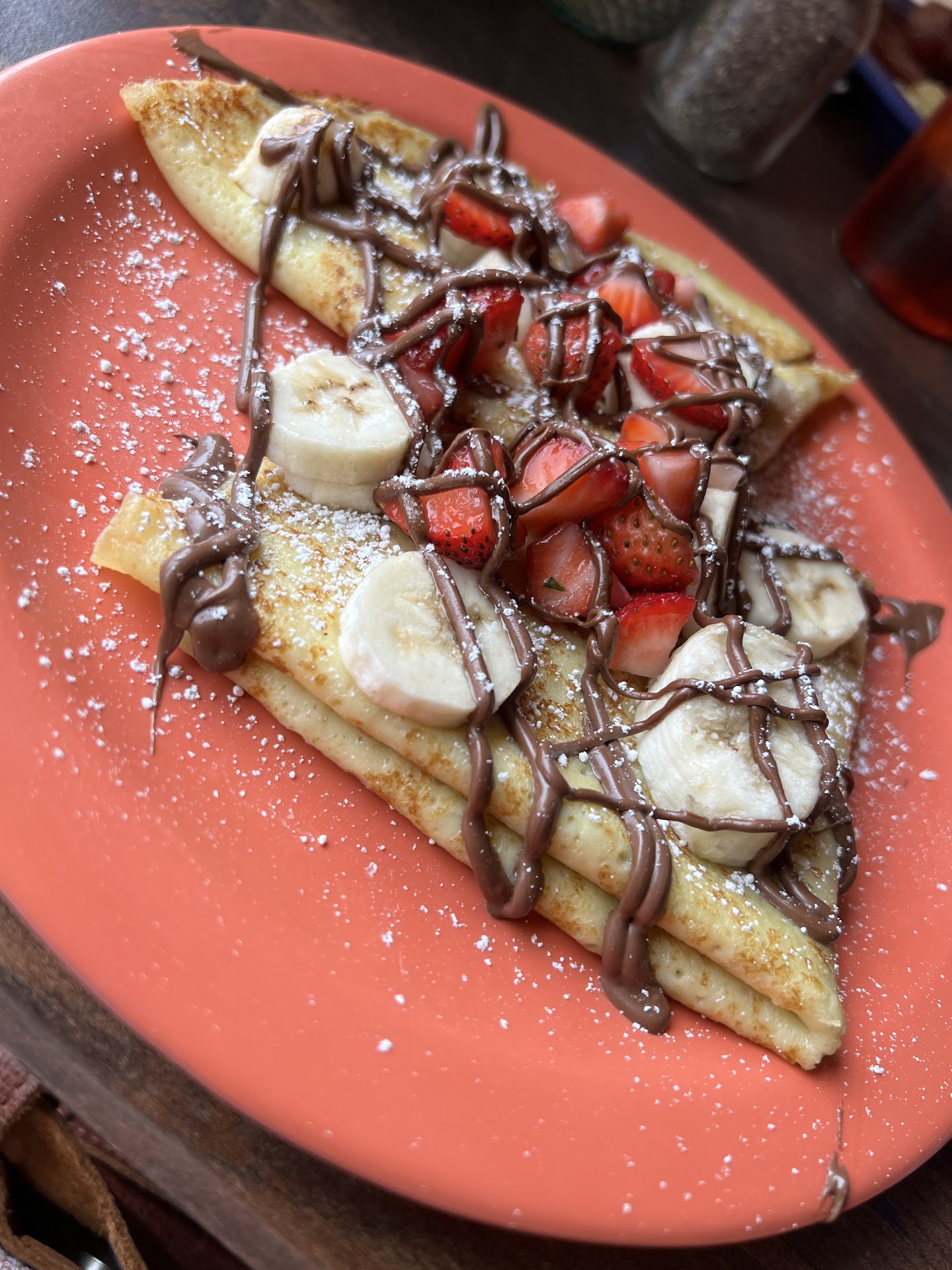 Our table ordered an assortment of breakfast food—Wildflower Breakfast with pancakes, blueberry waffle, piggie quiche and I got the Sweet Crepes with strawberry, banana and Nutella, and eggs over medium on the side. Everyone seemed pretty pleased with their meals.