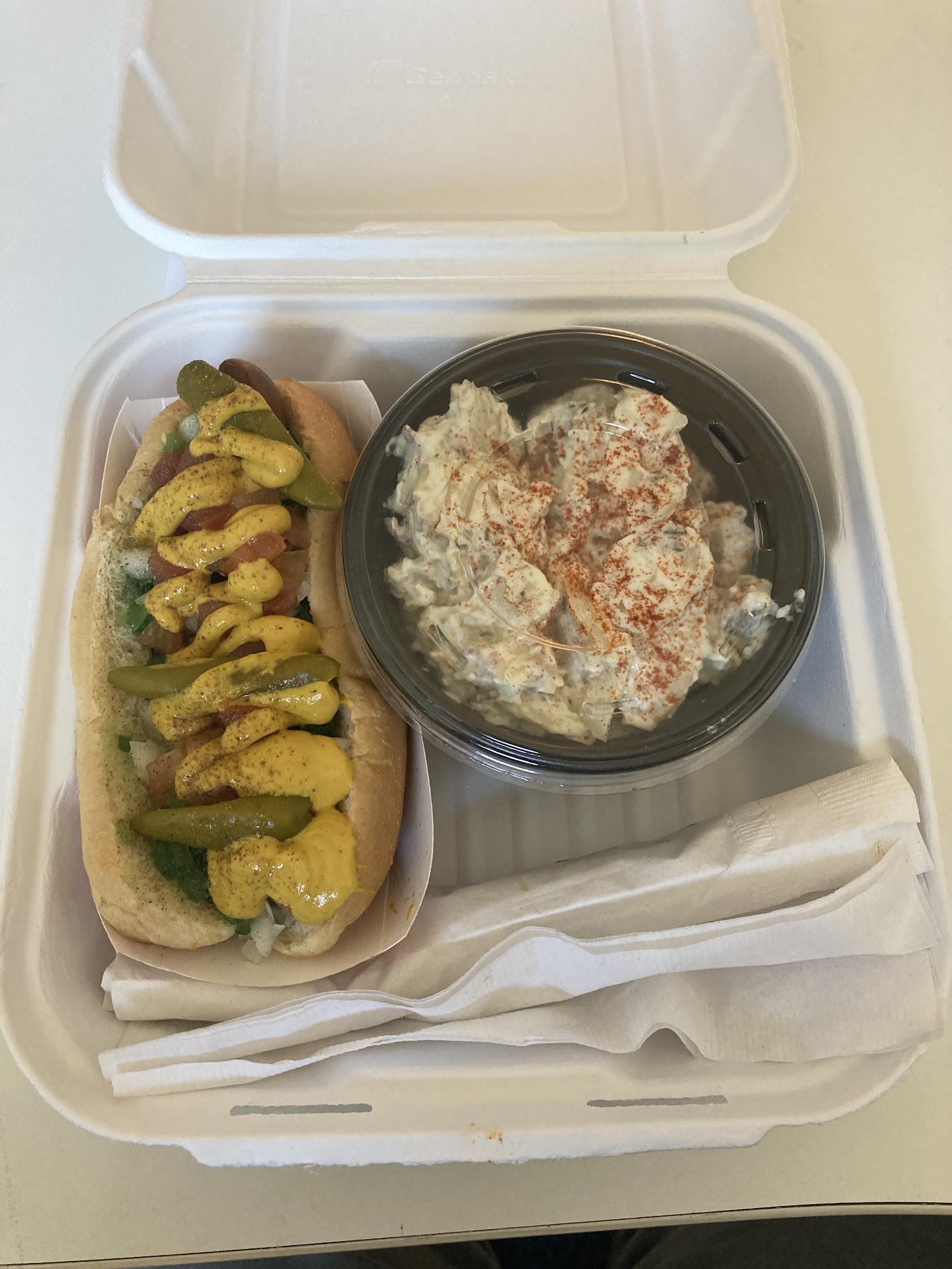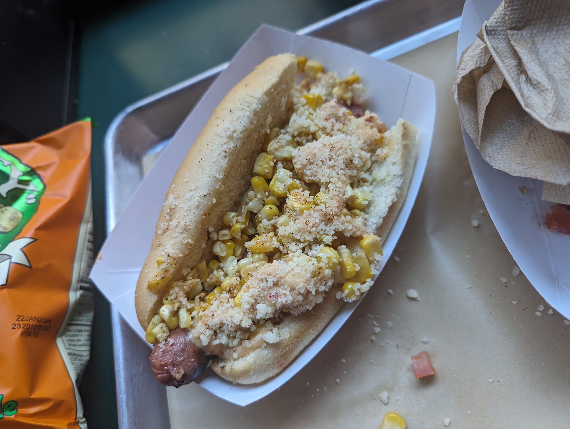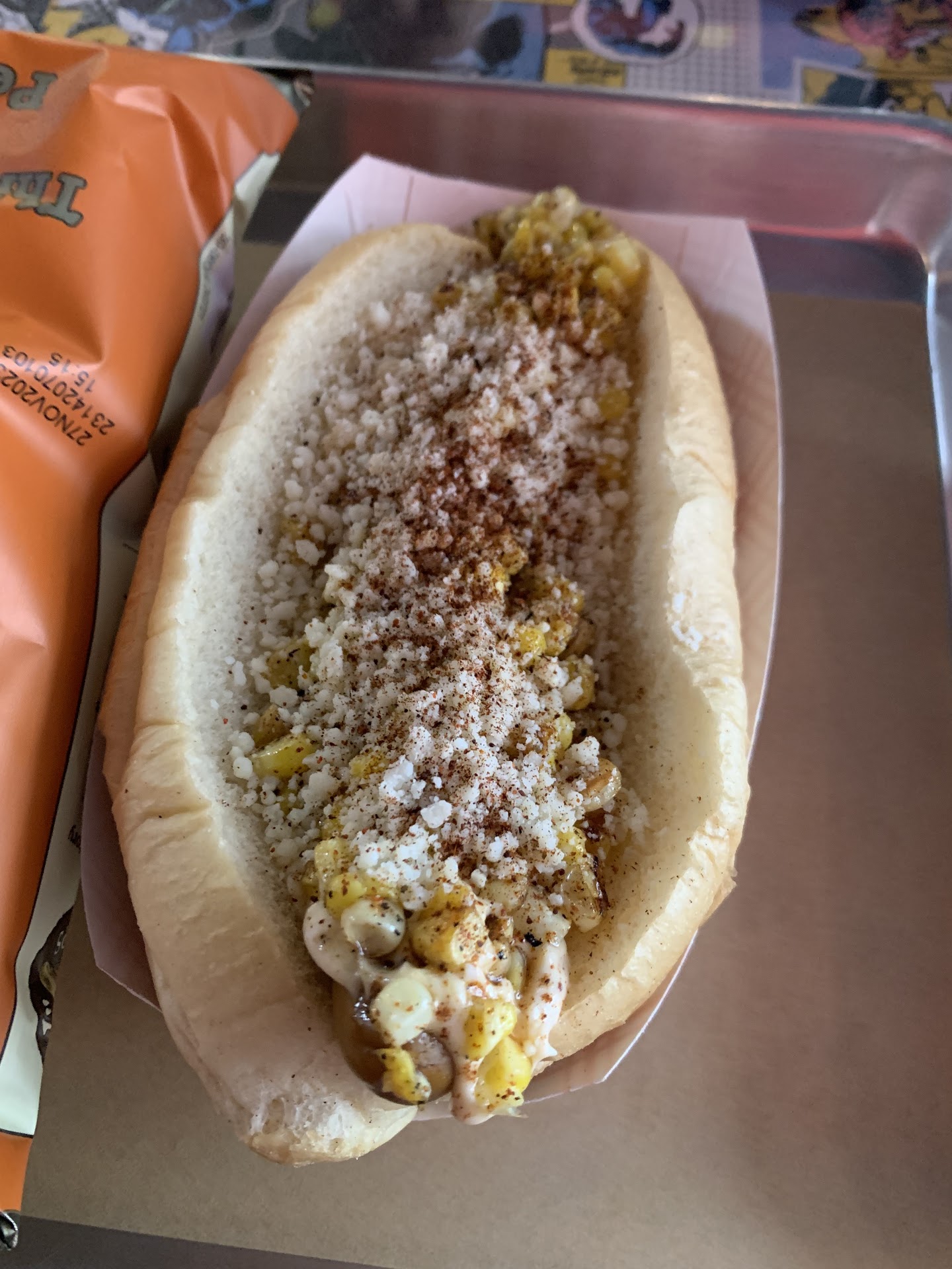 They add a bunch of toppings on top of the hot dog, so much so, that some of it falls off the dog and bun when you go to bite. The toppings are delicious and pair well with the hotdog, they really figured it out. But because of how high the toppings are topped it can be hard to eat.